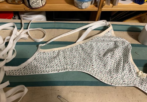 Well, lacking a proper back closure because the one I had in stash is AWOL, but otherwise complete down to the little bow to hide the wonky stitching where the cups meet.