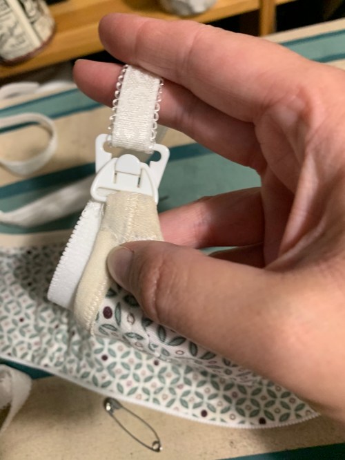 I used a 36” band (in the past in this pattern I’ve made the 34” band, but as I said my ribcage is a bit, um, expanded right now.) I have a really hard time figuring out my cup size in this pattern as it uses the method where you compare your full bust with your high bust. That’s still only a 2” difference for me right now and I was pretty sure the 36B it corresponds with wasn’t going to work. After taking some measurements of my breasts and the pattern pieces, I decided to make the largest cup size the cradle I had printed out would accommodate (36E), and then at the last moment freaked out and made some tweaks so I could make the largest size I had actually printed out, the 36F. This was probably not necessary, given the stretchiness of the cups, and they’re so tall the clips are almost on top of my shoulders, which probably isn’t ideal, but on the other hand there’s definitely some engorgement and expansion in my future before things subside. For my next one I’ll go down a cup size or two.
