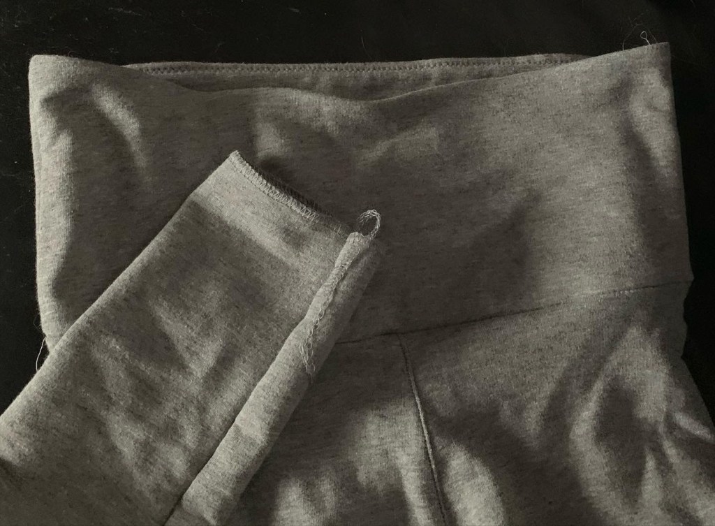This pair is made in a stretchy French terry but it’s a bit less stretchy than the cotton spandex I’ve used the other times I’ve made this pattern, so they’re a bit snug. Except at the waist, where I put very little tension on my 1/4” clear elastic, so it’s a bit loose. Although nice for not digging in. We’ll see how they do for staying up. The double layer of terry in the waistband is a bit heavy, but comfy.