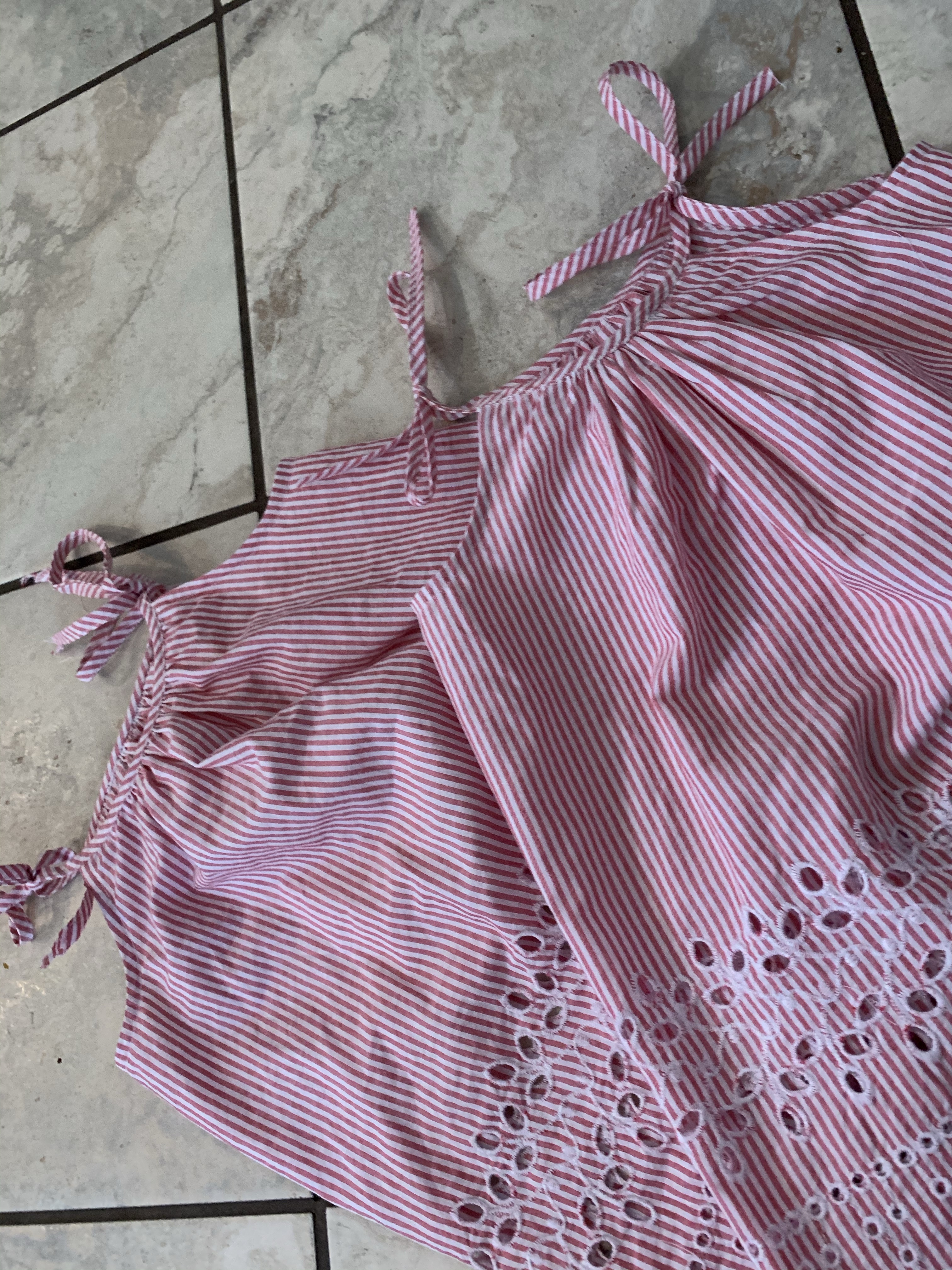 The fabric is a red and white striped cotton border embroidery I had pulled out last summer (which tells you how much of a disaster my sewing room is these days) with a vague notion of making matching dresses for all my girls… (I had originally bought it on clearance with plans for an 1880s cotton summer dress, so I have a bazillion mètres of it)