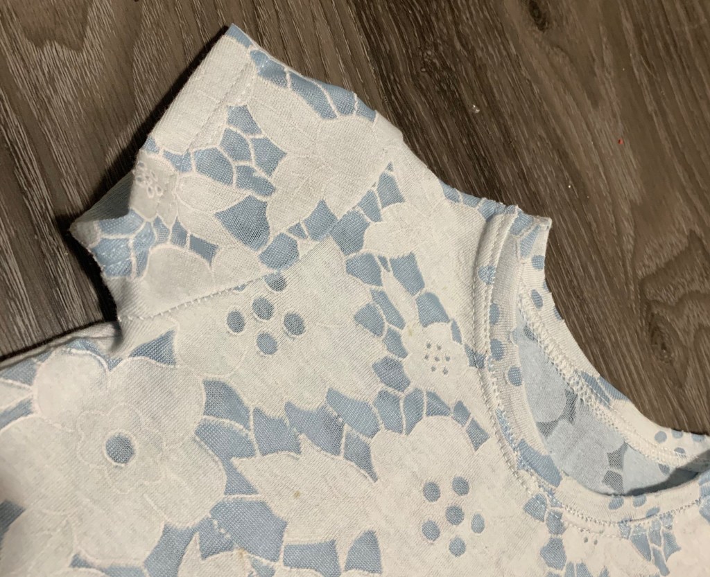 As I dug through a box looking for knit fabrics for an Adrienne blouse or Luna tank, I stumbled across a couple of wee scraps obviously hoarded from other projects. Why they’re in general population and not the scrap bin I couldn’t tell you except that outside of work my approach to organization is, um, lackadaisical. But anyway. There was a bit of pale blue burnout fabric that became another swingy tee, though I did have to cut the wee short sleeves on the cross-grain (this fabric hasn’t much stretch so it seems to be working)