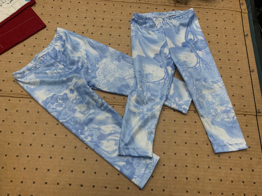 At the same time I was tracing S&S 850, I thought I would check out what the smallest size of my trusty old Jalie 2920 leggings pattern looked like. The smallest size is for 2 years, but it was actually smaller than the sweatpants pattern I used above, so I figured I’d test it out. Obviously it’s for leggings, not sweatpants, so the amount of intended ease (and stretch) is very different. I made it up in this beautiful/horrible slippery polyester blue print (covered in shiny silver dots) that is perfect for making a toddler happy. I figured the worst case scenario is I add them to the boxes of size 2 hand-me-downs I’m already hoarding. But the poly fabric actually isn’t super stretchy, so while they’re a little roomy now as leggings go I don’t think they’ll make it to age two. And I’m sure I don’t need to tell you I’m much fonder of the Jalie pattern.