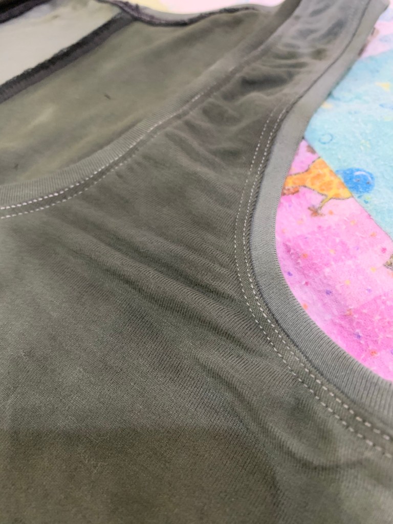The last couple of neckbands I have made turned out a little floppy, so I attempted to make the bands for this more snug and went a little too far in the other direction. Fortunately the coverstitch topstitching MOSTLY controlled the attempt of the neckline to gather up, at least for the moment, but we’ll see where we end up. I did better at the topstitching than I have in the past, at least!