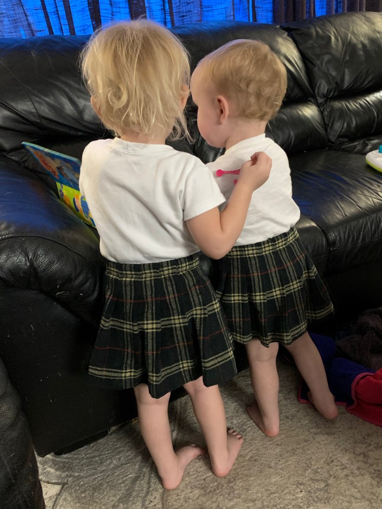 So, I measured roughly what seemed like a good skirt length for a two-year-old, plus a bit for folding over elastic, and tore off the long, hemmed edge. Oh, I removed the buttons, too, in case you were wondering. Once I had a long, hemmed rectangle, I cut it in half (because twins) and started pleating. In the end I didn’t have quite enough fabric for fully-pleated skirts, so they have a flat front reminiscent of a kilt, which I am ok with.