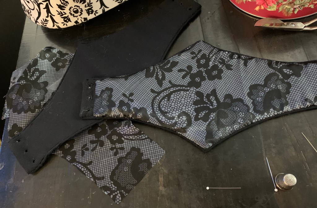 I used two layers of hair canvas, stitched to create the boning channels. A bone at each short end to support the lacing and two at the centre, although in hindsight I could probably have done just one at the centre. When I made the pattern I was still debating on whether I would want to have it open at centre front or back, so I marked a boning channel on each side there, and didn’t think about it. I used 1/4” spiral steel boning, which is basically my default, although I might’ve gone with spring steel if I could’ve found my tin snips. (My corset-making box has gotten sorely denuded as I haven’t made one in a long while—the needle-nosed pliers also got plundered for other household tasks, forcing me to hunt down replacements, and my good wire-cutters somehow got switched for larger but inferior ones. All of which added time and frustration to what should’ve been a small and simple project. Anyway.