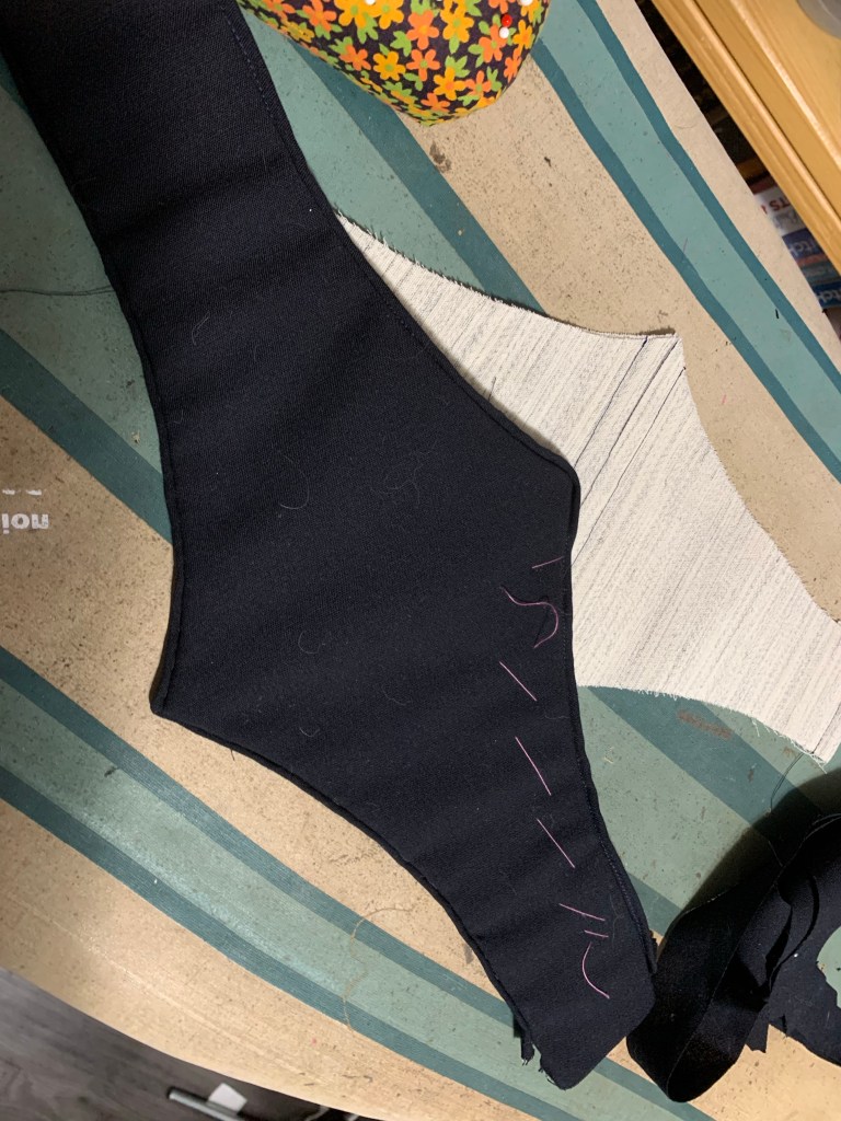 I couldn’t find my cotton ticking (my first choice for light-weight corset-type things), so I went with hair canvas for the strength layer. By some miracle, my hunt for scraps of black fabric turned up the last remnants of my tropical-weight wool suiting used in this dress many moons ago, and there was just enough room in the odd-shaped scraps to cut the main pieces on grain and the bias strips for the piping more-or-less on bias.