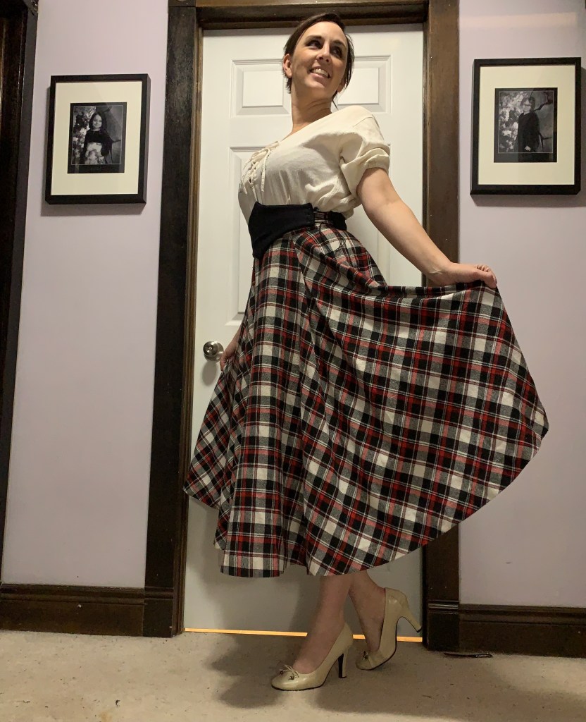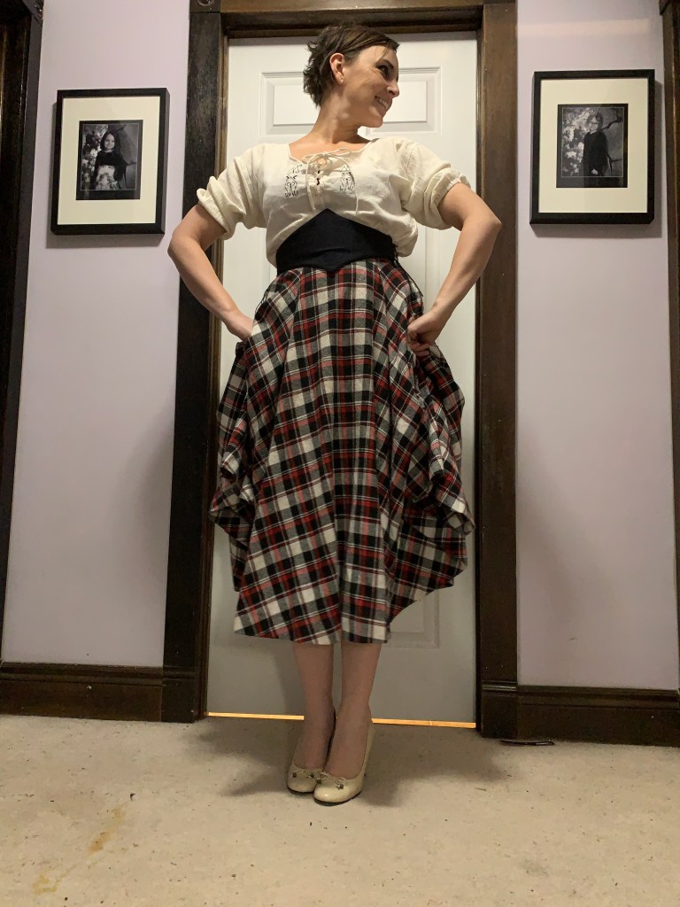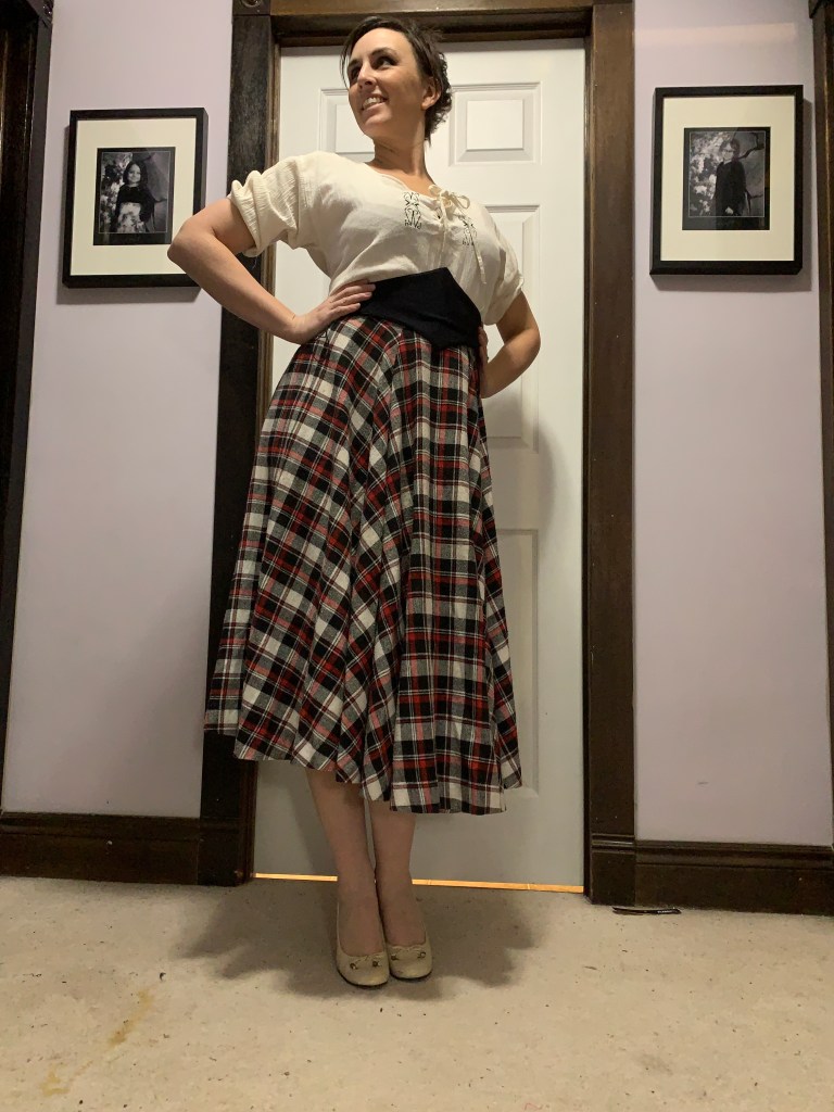 As I toy with historically-inspired and whimsical touches to add to my wardrobe, I decided a modest Swiss waist would be a fun addition, that might make blouses like the shirt refashion something I could actually wear. I’ve never liked how I look in loose tops tucked into a waistband. Or gathered skirts for that matter. It has something to do with the shortness of my not-so-narrow waist. But, the addition of a wide belt can help with this, and a Swiss waist seemed like a very fun way to play with this idea.