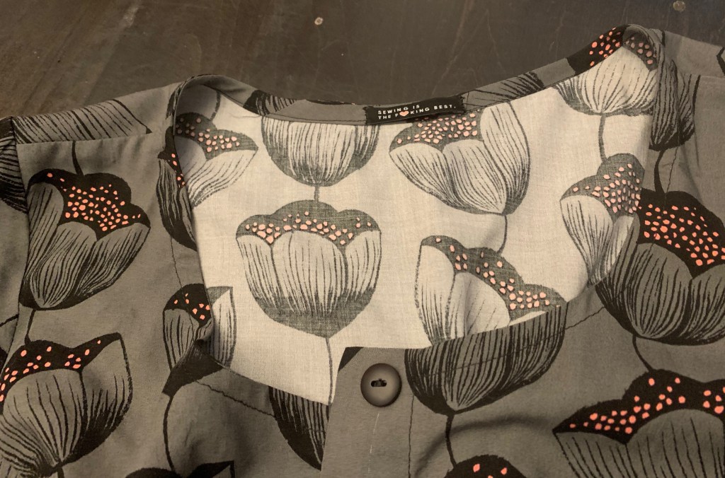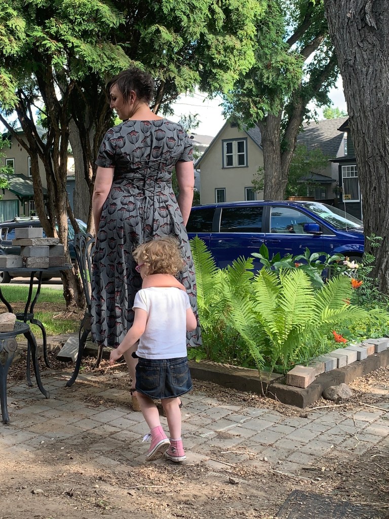 I went with the most plain and boring of black plastic buttons, again from stash. I think they are a good pairing with the print, letting it hold the spotlight. And, I am pretty sure they came from a giant mixed bag of buttons bought when I was first stocking up on sewing supplies in 2010 or so. So nice to use a bit of deep stash, even if they are not particularly interesting. I did kind of accidentally place my buttons holes horizontally (my default) rather than vertically as the pattern called for. To be honest I think I just prefer sewing them that way, and I’m more used to it so my rusty sewing brain defaulted to it. There are also a LOT of buttons, because I like them fairly closely spaced, for maximum support against gaping especially when I’m doing something silly like adding back lacing to a dress that’s already well fitting. I made sure there was a button placed at the full bust point, at the waist, and then filled in in between. I will say, for a tool I always thought was a luxury, I ALWAYS use my button-hole spacer and it makes this process so quick and simple.