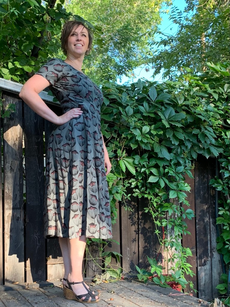 Well, as soon as I saw the Scroop Patterns Robin dress come out, a couple of years ago, it was obviously the perfect example of this style. So I bought it. And then, well, life happened. I got it printed up ages ago. I had fabric picked out last summer. This spring, I picked out a different fabric, a Cotton + Steel rayon print called “Magic Tulips” that was a gift from a sewing friend.