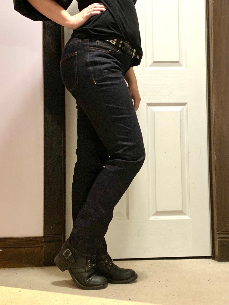 I sewed the side-seams with a fairly generous seam allowance, and wound up taking them in 1/4” more after that—and I’m fighting the urge to take them in more, telling myself we’re going for a slouchy boyfriend aesthetic as opposed to the sprayed-on-skinny look I’ve been pursuing since I got my first pair of stretch denim jeans in 2000.