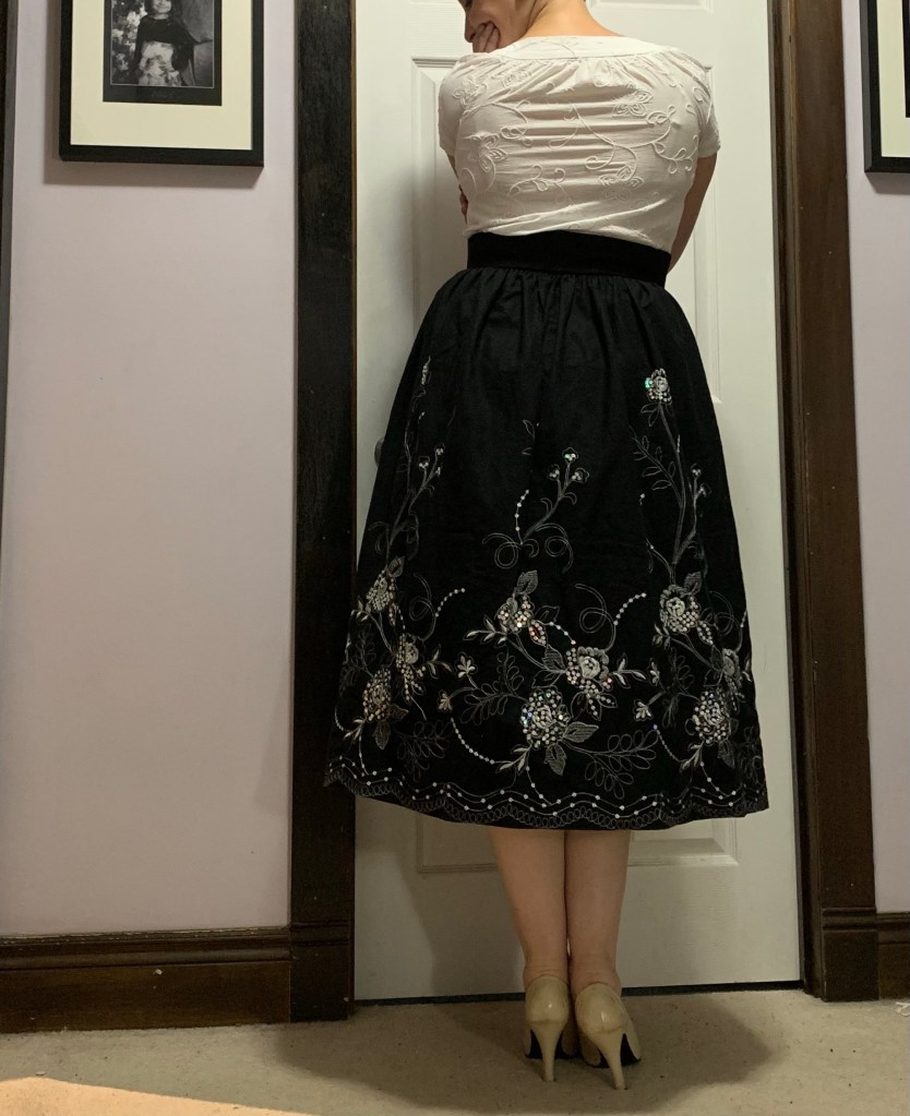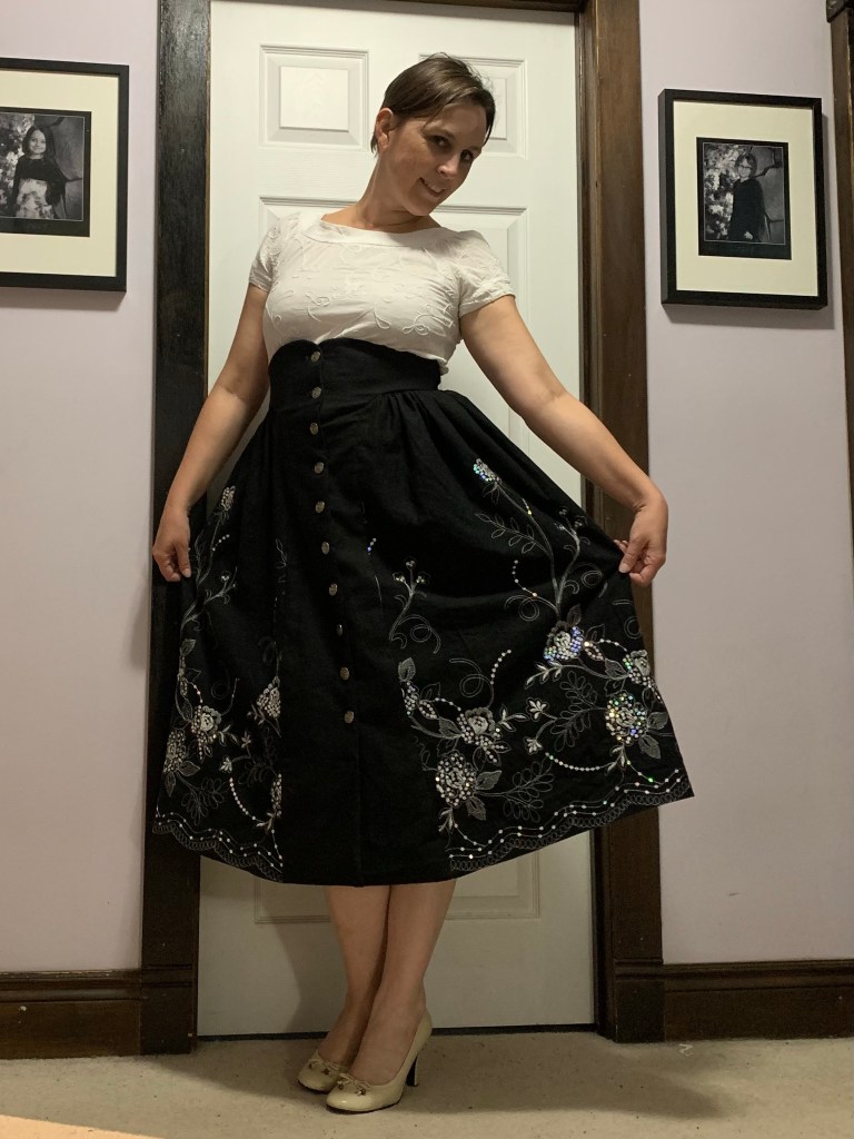 Anyway! It’s a skirt! It worked! It’s a garment which does challenge me on a few levels. I don’t usually care for anything gathered at my waist, ever. The length is a bit odd, too, although that weird midi length seems to be popular of late. Most notably, it doesn’t have pockets, which may be an issue if I ever try to wear this to work.
