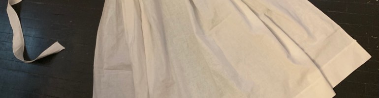 Fast forward to last Sunday, when my friend Diane was bestowing some pieces from her stash on the Victorian Sewing Circle. Being a glutton I took just about everything (oops), including a generous mètre of wide white slubby fabric… I’m guessing a linen/cotton blend. And, desperate to reduce what I was adding to my stash, I decided to transform this piece into a quick and dirty version of the long-coveted apron.