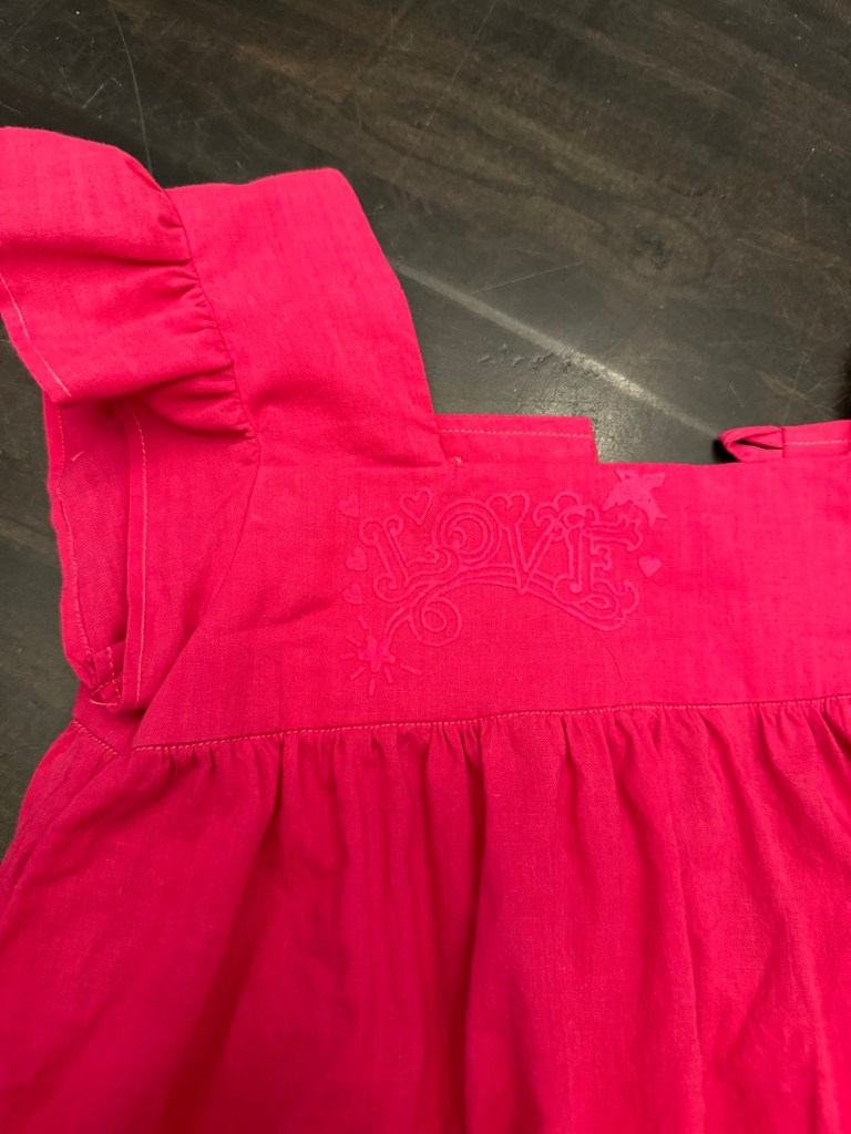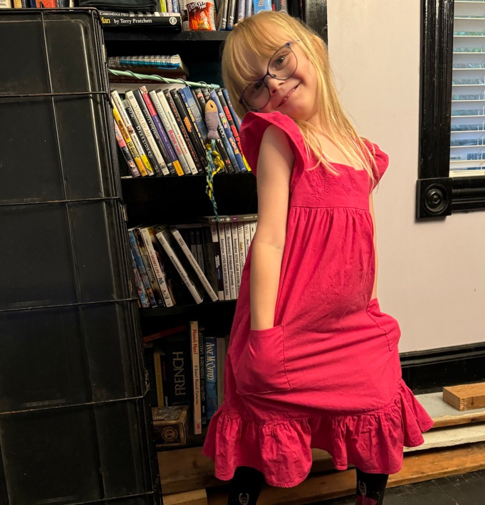 And then when I tried it on Tris (who is nearly five!) this size 4 pattern was massive! So to bring it in just a bit, I sewed the buttons on way over to the side, overlapping the back panels substantially. This looks a bit funny but the improved fit is worth it so it’s not constantly slipping off her shoulders.