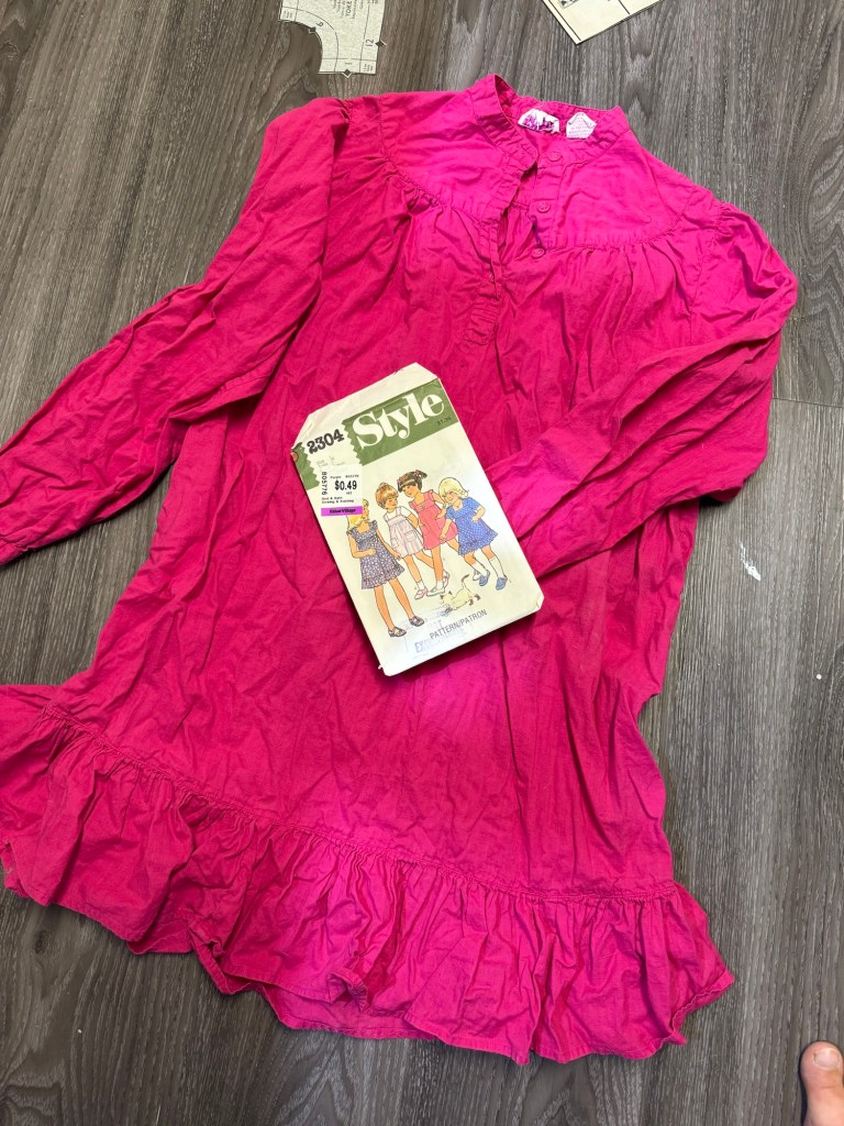 We settled, after much wrangling (four year olds are highly creative in their project concepts, but very low on practicality and, well, taste) on transforming this old, eye-wateringly hot pink, blouse (donated to the cause of children’s wear by my aunt), via a 1970s Style pattern: