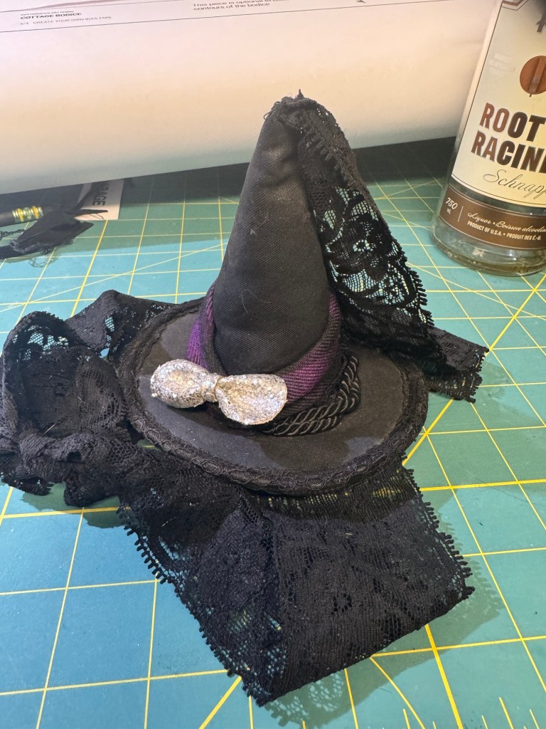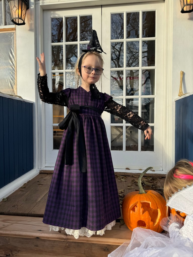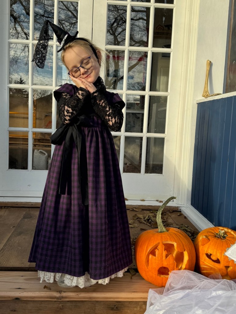 To really sell the witch look I added a scrap of the purple fabric to the teeny witch hat I made for my Hallowe’en outfit a decade or so ago, and the real miracle here is that I could actually find the little hat. Tris would probably have preferred a full size witch hat, but considering how little time I’ve had to sew this fall, and the dress itself was finished at 10:30 at night the day before Hallowe’en (despite being started in September) that was not going to happen.
