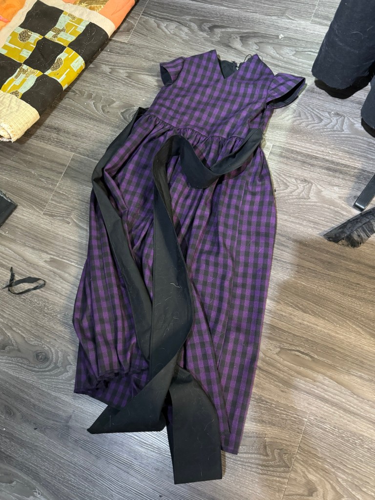 And black lace sleeves. I didn’t get much for construction pics. I used the size 4, roughly, but tried to add length to the sleeves and skirt. The amount of the plaid fabric was very limited, so the skirt is probably a little less full than intended. I’m glad I added the sash ties as otherwise the bodice would be really wide and blocky. I sewed the sleeves with some massive seam allowances to narrow them down, also.