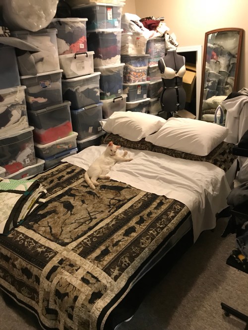 I don’t know what you’ll hold except more of the same, which is mostly a good thing. I’d like to make resolutions—get more exercise, eat better, but the fact is I’ll probably just muddle along trying to keep my head above water. If I can keep the fabric stash from growing too much that’d be good. Not out of guilt, but out of the practicality of my sewing space. Also I need to figure out how to fit some more tabletop space down there.