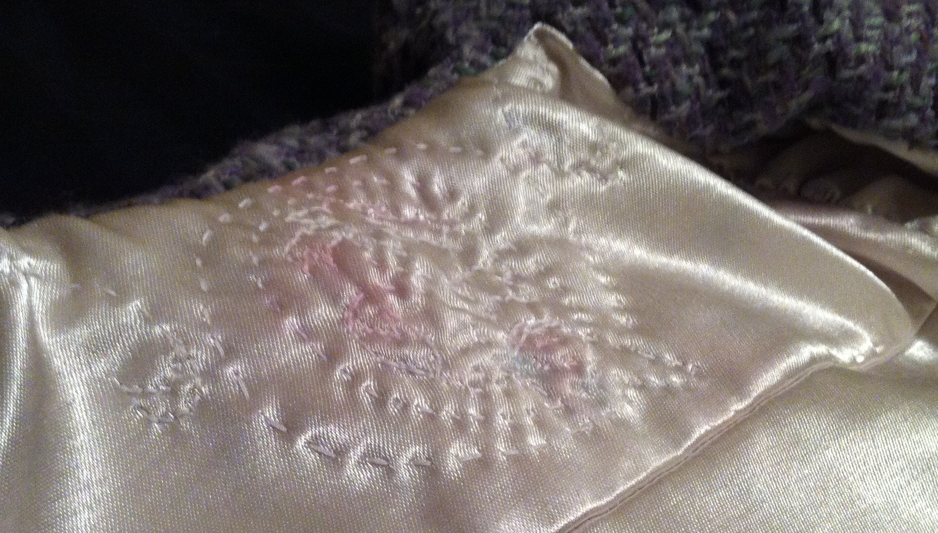 I got it into my head, during the gap between cutting and actually sewing it up on Sunday, that I should quilt the back yoke. The thought process actually went: I want flannel interlining. Interlining is sometimes quilted to the linings. Think of those gorgeous quilted petticoats you like so much. I could totally do something like that! I should quilt a “Q” onto the back yoke! Then I tried to add a bunch of curly, floral bits. I’m not good at either quilting or embroidery, so I don’t think my results are terribly legible or lovely but, well, there is a Q there if you look closely. There are also some pink smudges, because when I washed the piece to get the little purple tracing-paper dots off, it appears the pink bears on the backing flannel bled. Aargh.