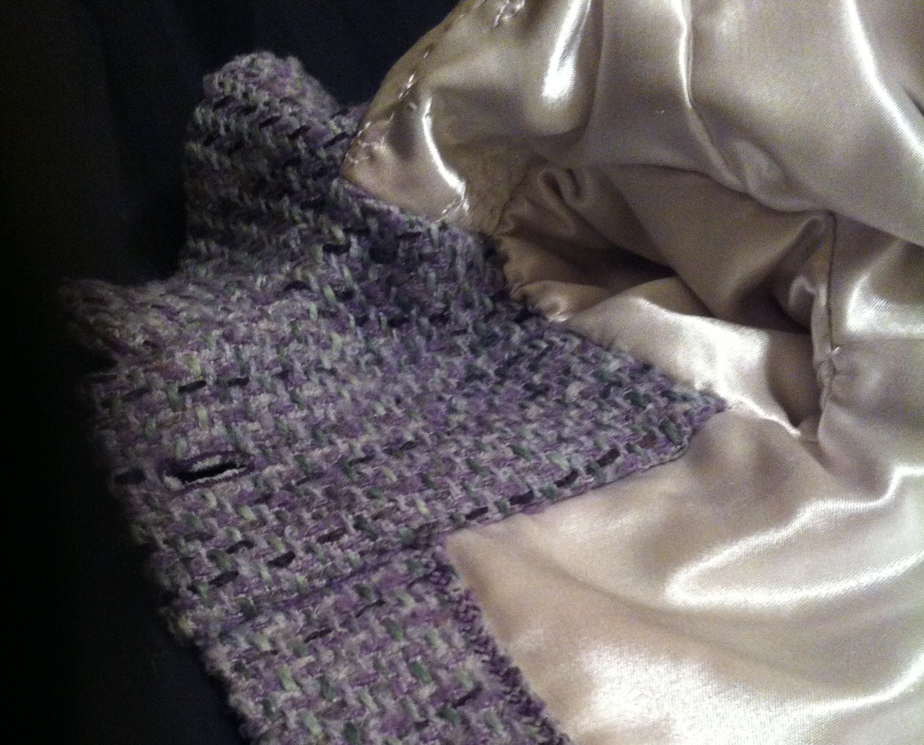 I had hoped for two buttons for the closure (as per the drawing) but couldn’t find any pairs in stash that worked as well as this one perfect purple button. You can see I made no adjustments for turn of cloth when stitching the collar. I only had one afternoon to construct the whole thing, I wasn’t really thinking about fine tailoring.
