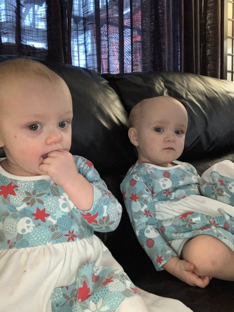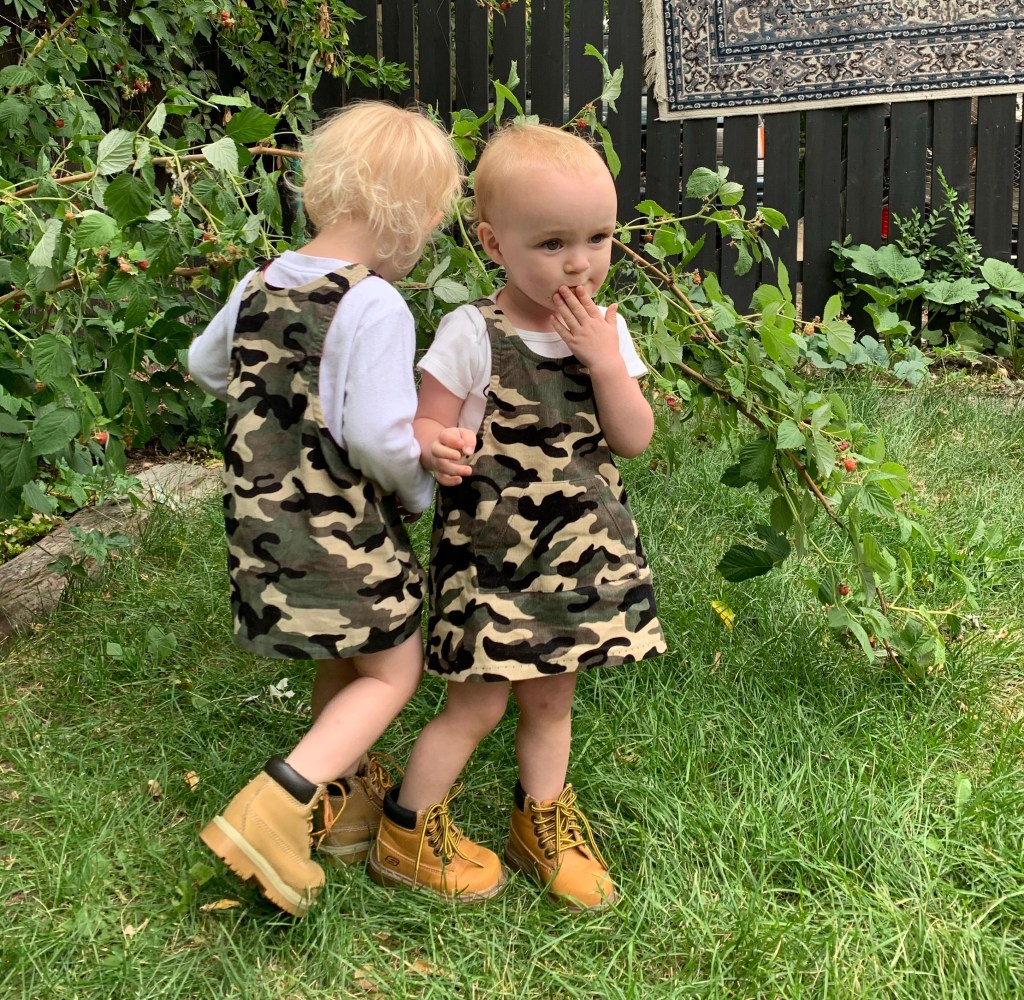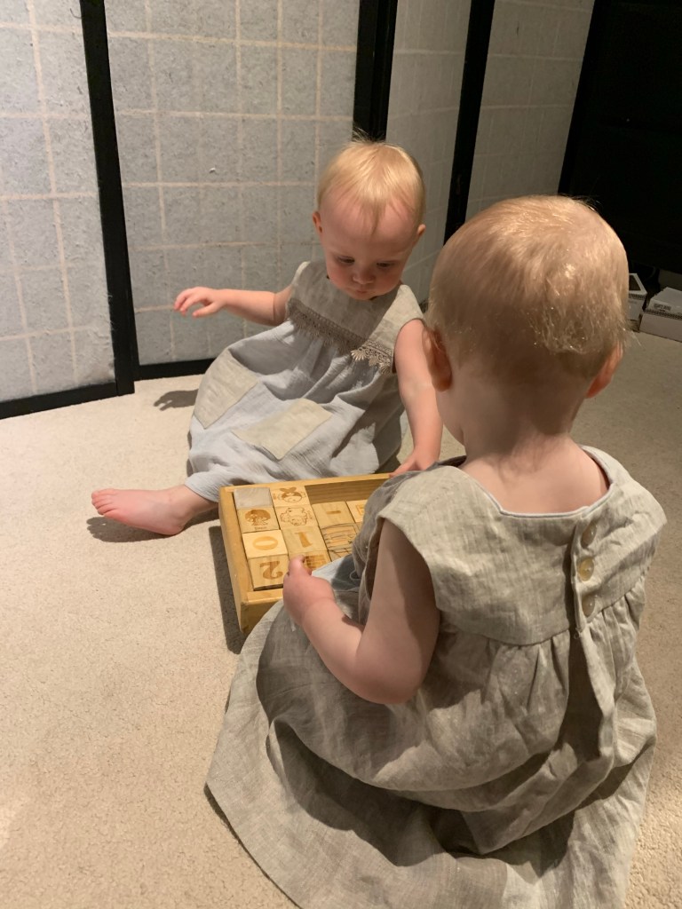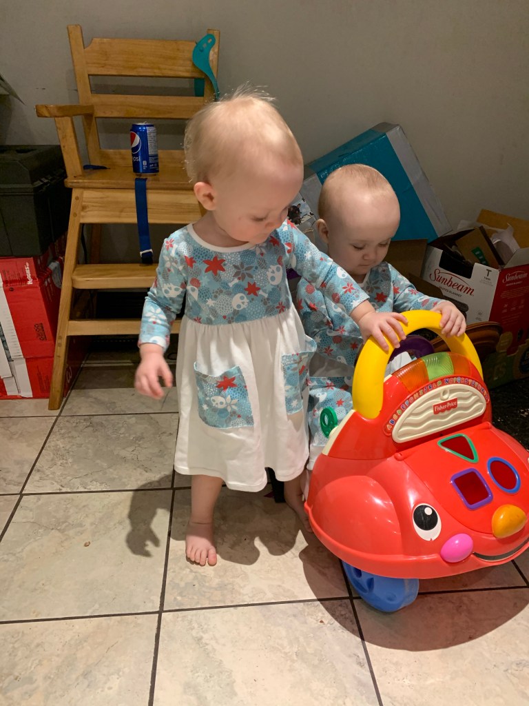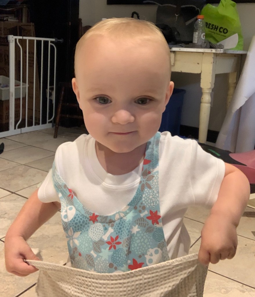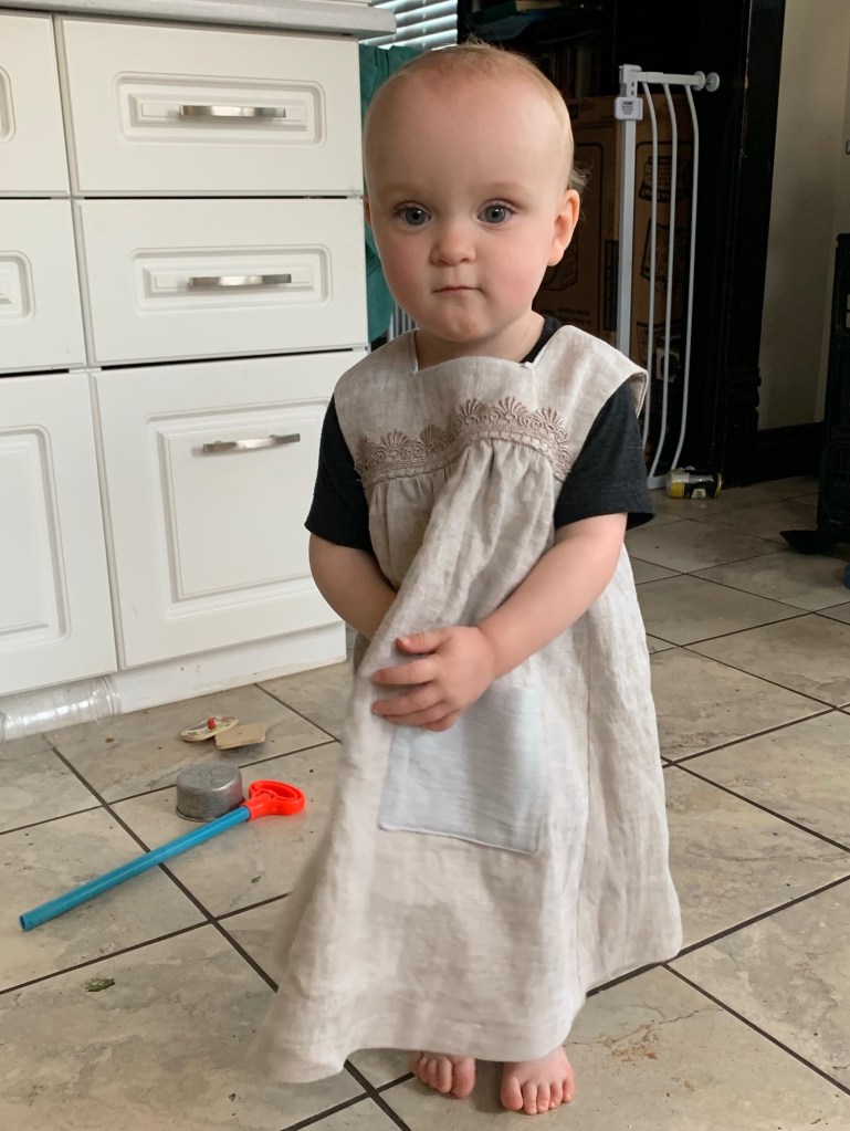 They are pretty basic aprons, but the size turned out PERFECT for my rather runty two year olds, and they’re just what I wanted. My husband would’ve preferred a loop around the neck to the ties, but I wanted them to be adjustable and also a loop big enough to go over baby heads would put the bib quite low on their chests.