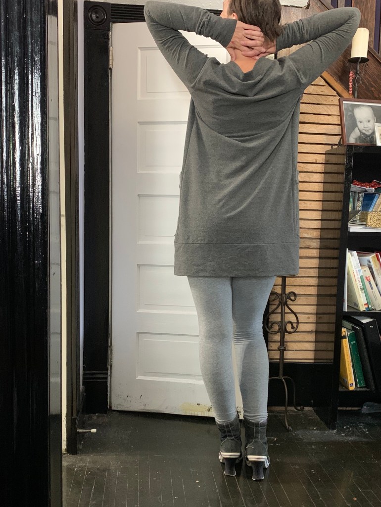 I made only one change to the pattern, deepening the pockets so my big ass phone sits securely down in them. However, I missed one critical fact about my fabric. Unlike any other sweatshirt fleece I’ve worked with, this one has its main stretch vertically. I didn’t notice—didn’t even think to check!—until the sweater was completely finished, so there’s not much to do about it. It fits fine, except the sleeves are quite snug, and hard to push up to wash your hands. Oops. Meanwhile they stretch loads lengthwise. Oh well.