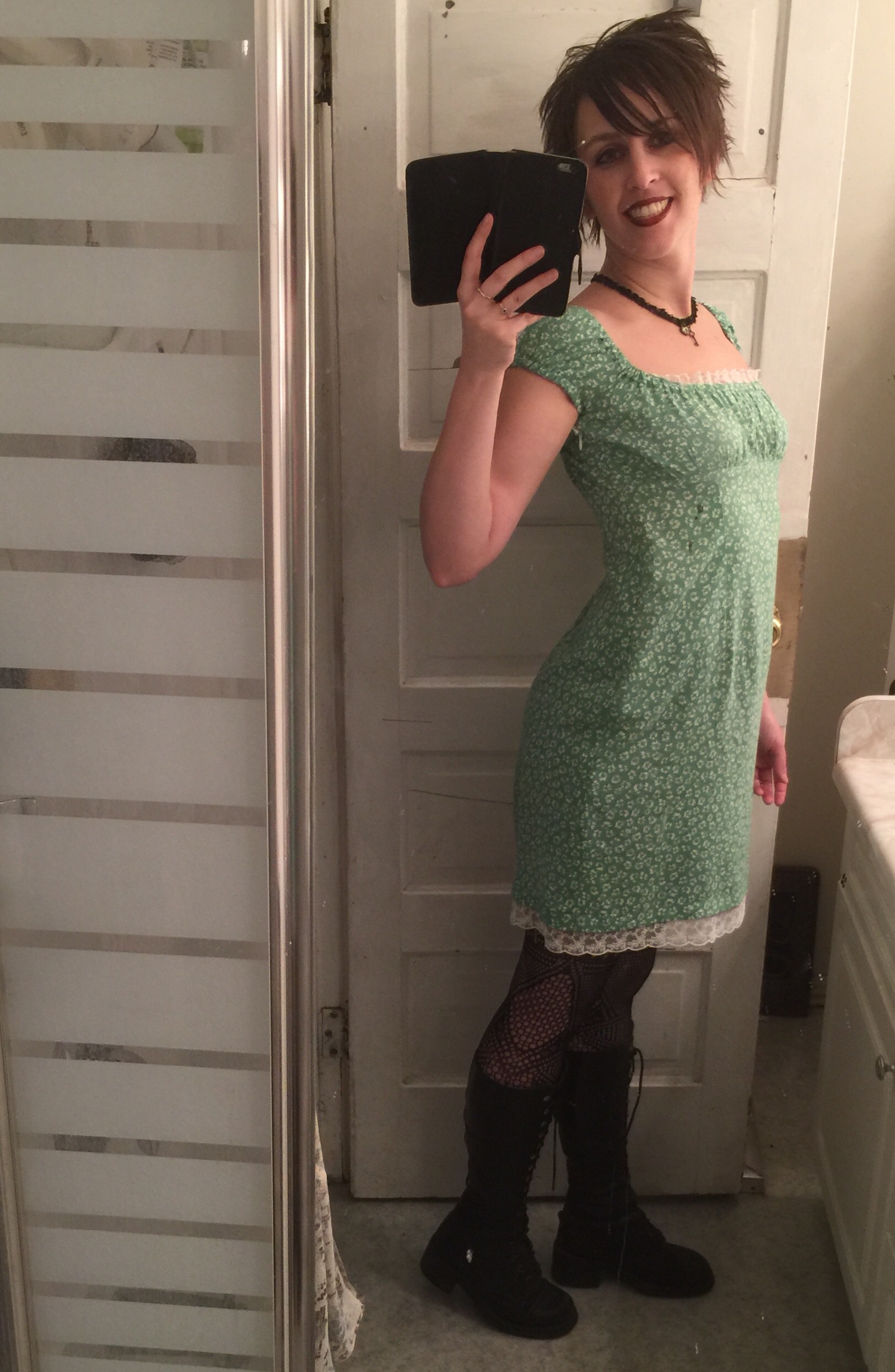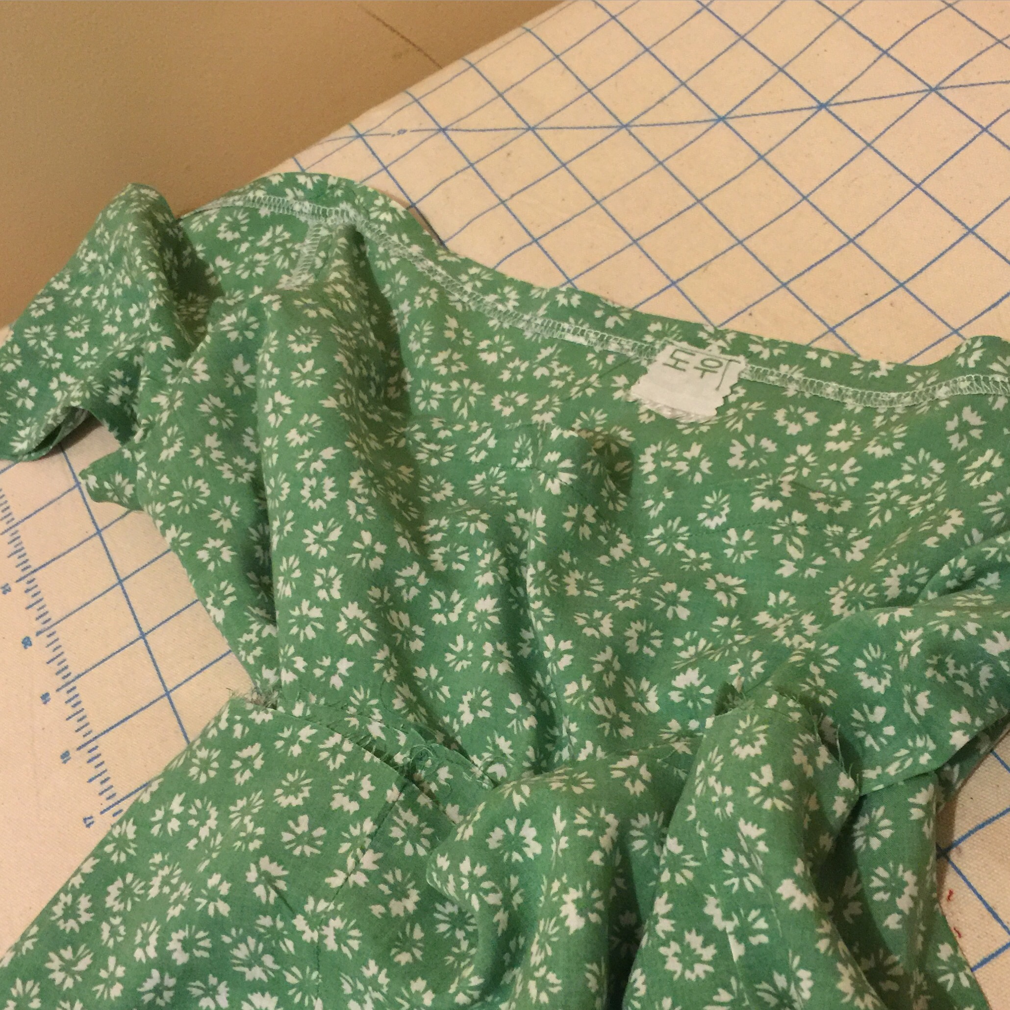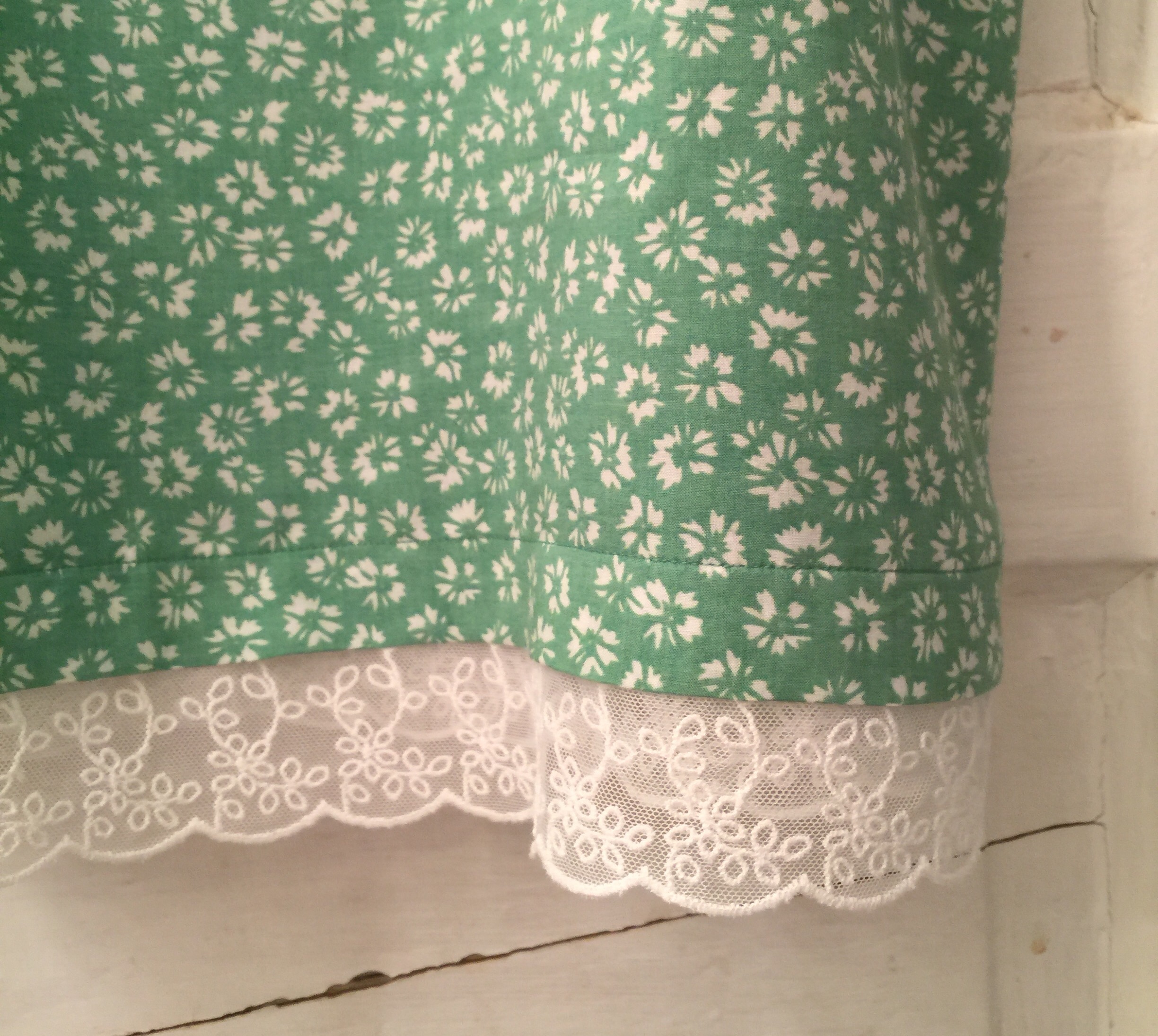 So a little while ago, I fell in love with a fabric at work. Because that doesn’t happen like every two seconds. This was a sweet rayon with a print that felt very vintage, in a soft green that is not at all my usual palette. And then we got this adorable embroidered net lace, and the pairing raised the delicate sweetness to soaring heights. Completely in love. But a little worried about making something from it that I actually want to wear. I generally like a wee bit of an edge to my sweetness, and lately I’ve been feeling that a bit more keenly. This rayon seemed like it wanted to be a drapey 30s or 40s style dress, which are sweet but not really edgy.