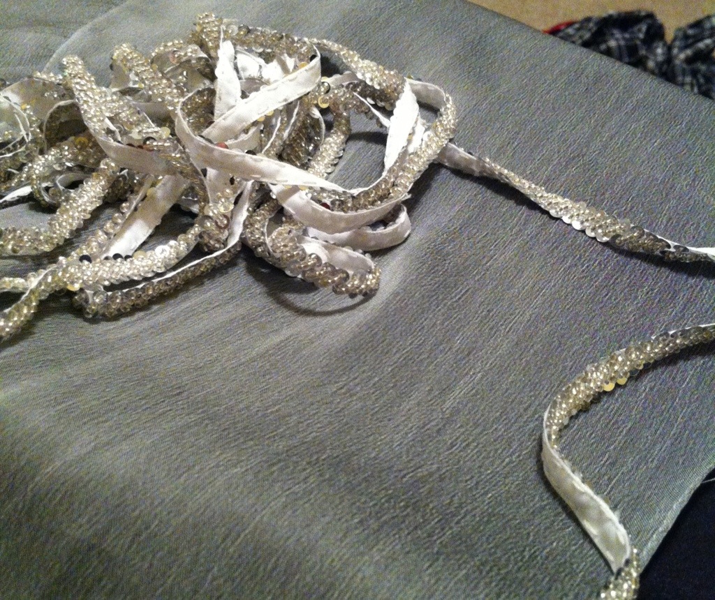 I knew from the practice dress that I wanted to pipe the upper edges of the bodice, but I had decided I wanted a silver piping rather than just the white on white. I had silver chiffon left over from the skirt overlay for the Maid of Honour’s dress, but experimentation determined that it needed a solid silk under-layer to look really good.