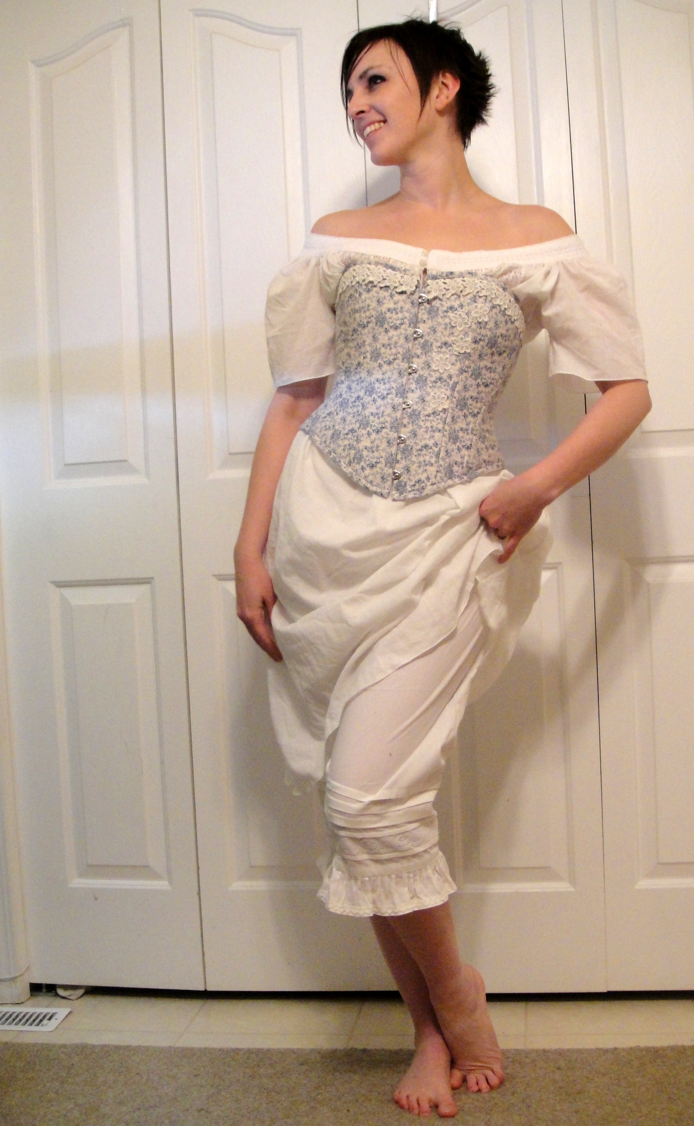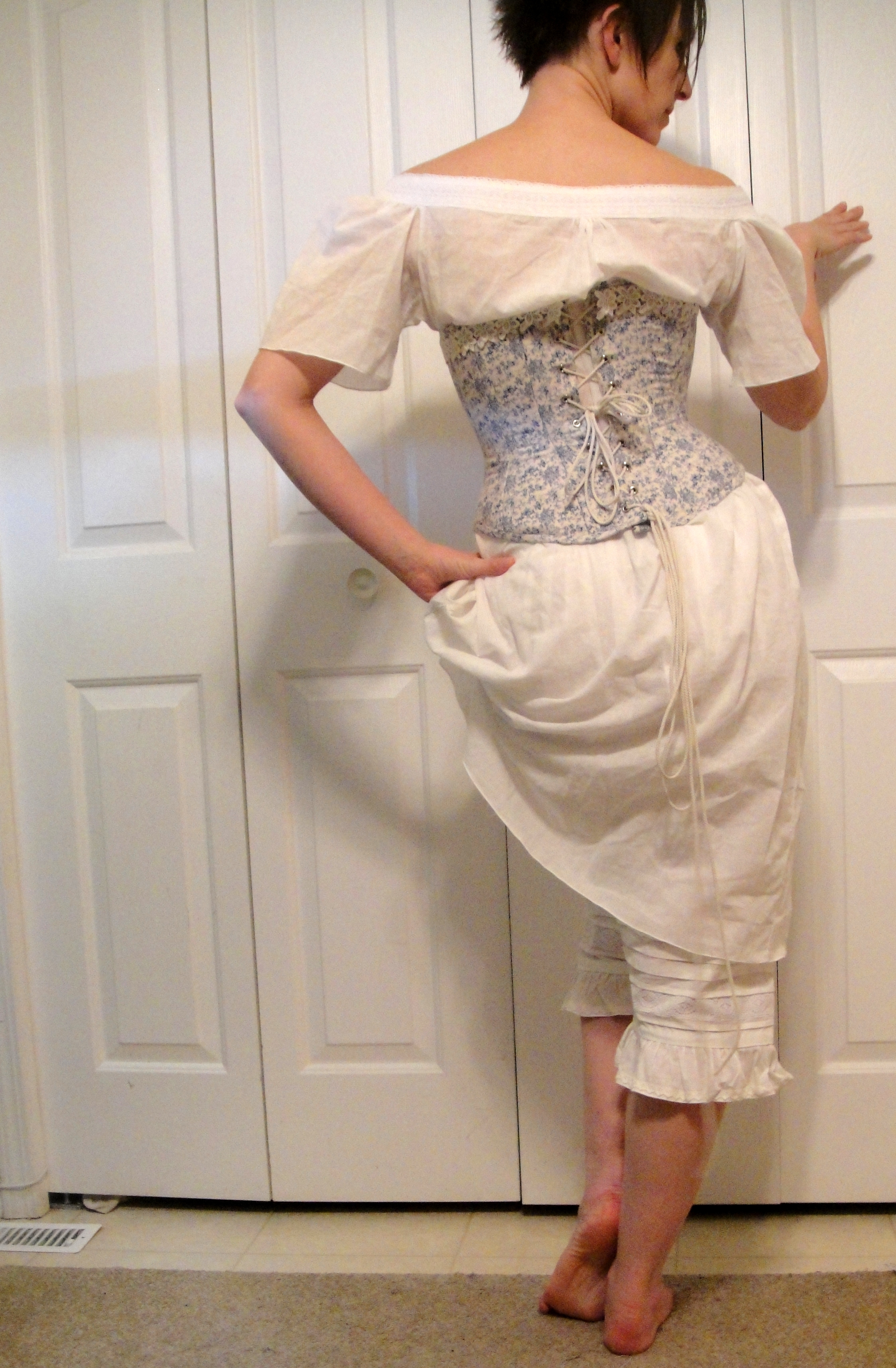 ANYWAY, I was startled how much waist reduction I did get just as a quick, bone-free try on (before my cotton string “lacing cord” broke)… well, reduction for me, anyway. I have very little space between my ribcage and hips, and my ribcage is tubular, or maybe just barrel-shaped. As in, doesn’t taper towards the bottom. Let’s just say I’m not expecting dramatic results.