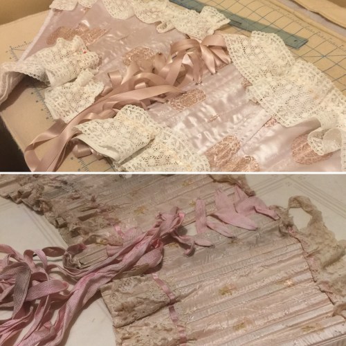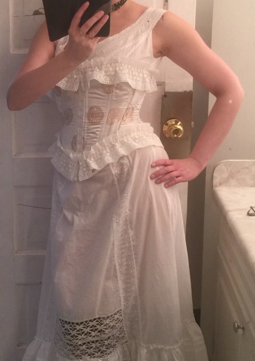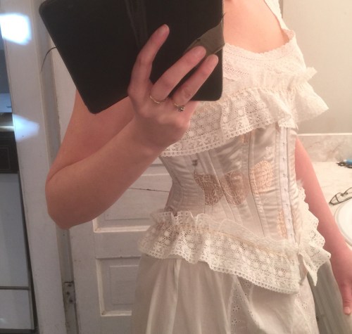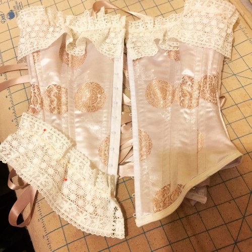 I kind of got ahead of myself in the finishing department, adding lace and binding to the top of the corset. I will probably regret that when/if I do have to re-shape the bust seams. Oh, well. The lace was one of those random remnants that floats about a stash, but there was just enough to do the top of the corset—perfect. (OK, with five flowers left over. I’ll call that perfect.)