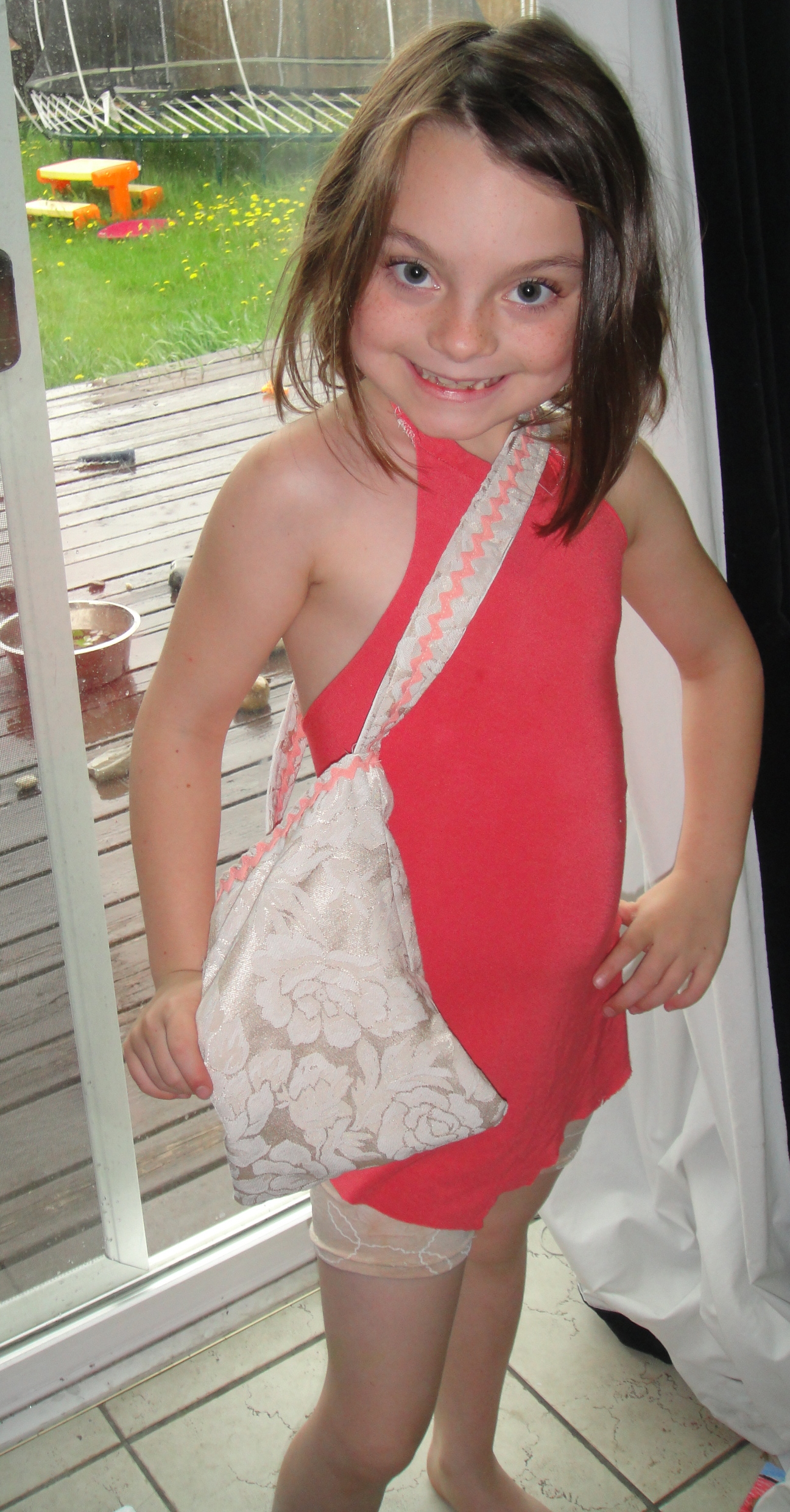 While I’ve been dithering over the hubs’ coat, Syo seized the opportunity to sneak onto an unattended machine and whip up a little purse. Her being extremely proud of her creation, she asked me to blog about it. Me being putty in her cute little fingers, immediately snapped some photos and set to.