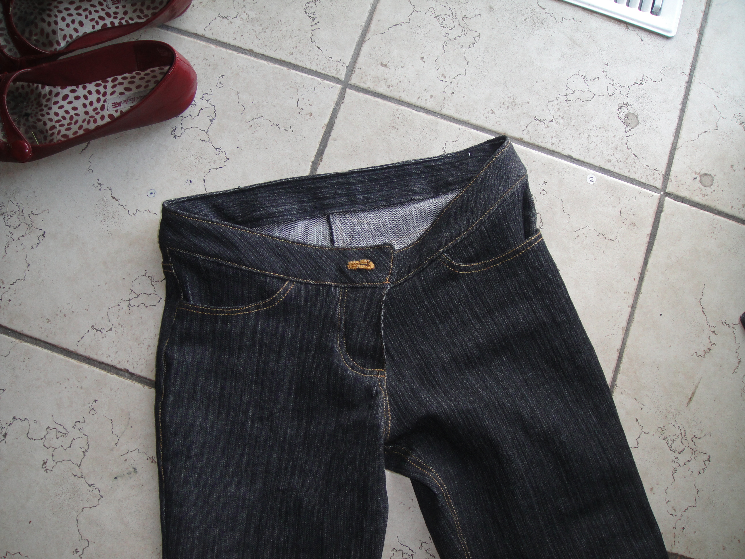 My fly interiors are not generally things of great beauty, and this one isn’t, either, although it’s one of my better ones. I won’t get into how many needles I broke as soon as I started trying to do zig-zags—bar tacks, buttonholes, attaching the belt loops. There was much howling and unpcking. I HATE unpicking bar-tacks. It got better when I ran out of topstitching thread and just used regular blue thread. I may do that for all bar tacks/dense zig-zags in the future. The buttonhole elastics emerge from gaps in the seams where I had to piece the waistband.