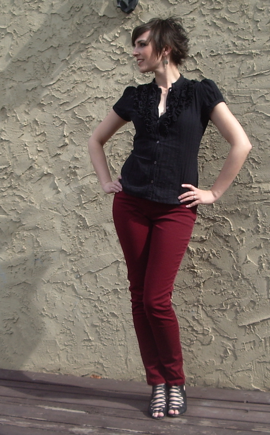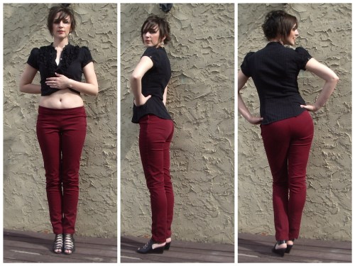I paired my trial, not-really-opaque-enough-for-public version of the tee with my red clovers, cuffed to a high-ankle length, for the purposes of the photos. I think I’m liking this length better, and they are *much* more comfortable with belt-loops, although the belt doesn’t help with the front-sag, since the belt wants to sit exactly where the waistband wants to sit. Anyway, we’ll see. The weather is a long way from ready for this look, anyway.