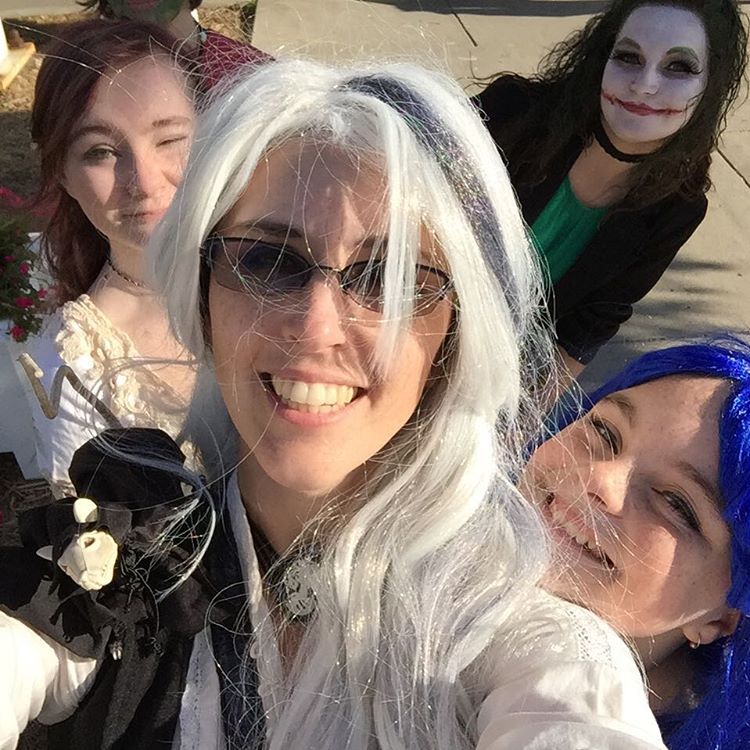 All in all, it was pretty nice to just throw something together from what I had (because let’s face it, at this point I have quite a bit). In the end, the hardest part was probably adding the black streak to the white wig I found… via Sharpie marker. Maybe not the best way to do it… 😉