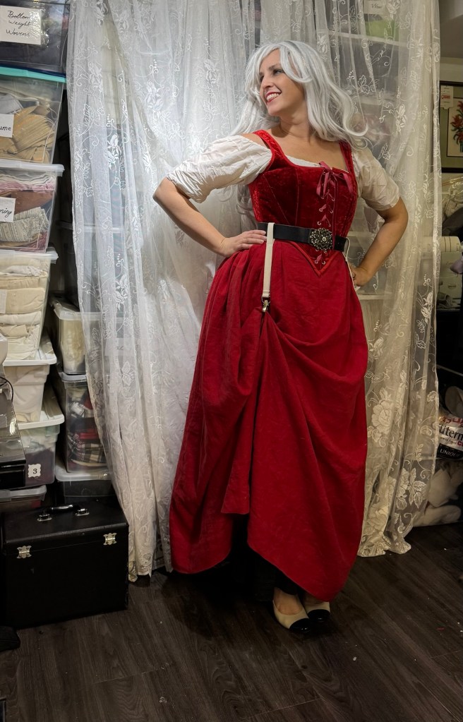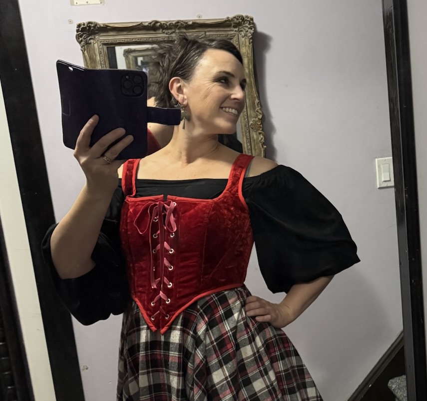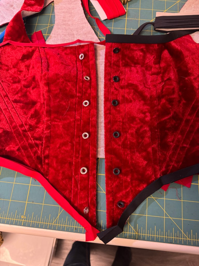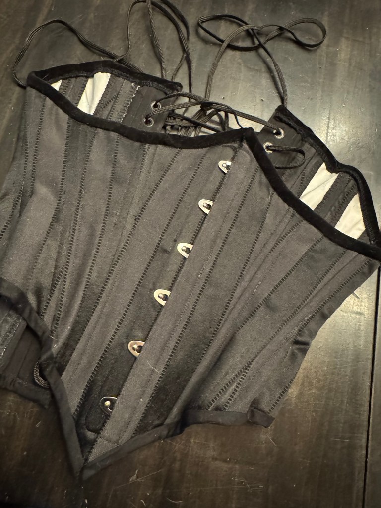 I used a lightweight black (homemade) bias tape to bind the bottom, and some bias velveteen to bind the top, for a luxurious line. Not sure that I totally love it, as it adds more bulk at the top, but I didn’t have enough of the bottom tape for the whole corset. It is pretty and luxurious, though.