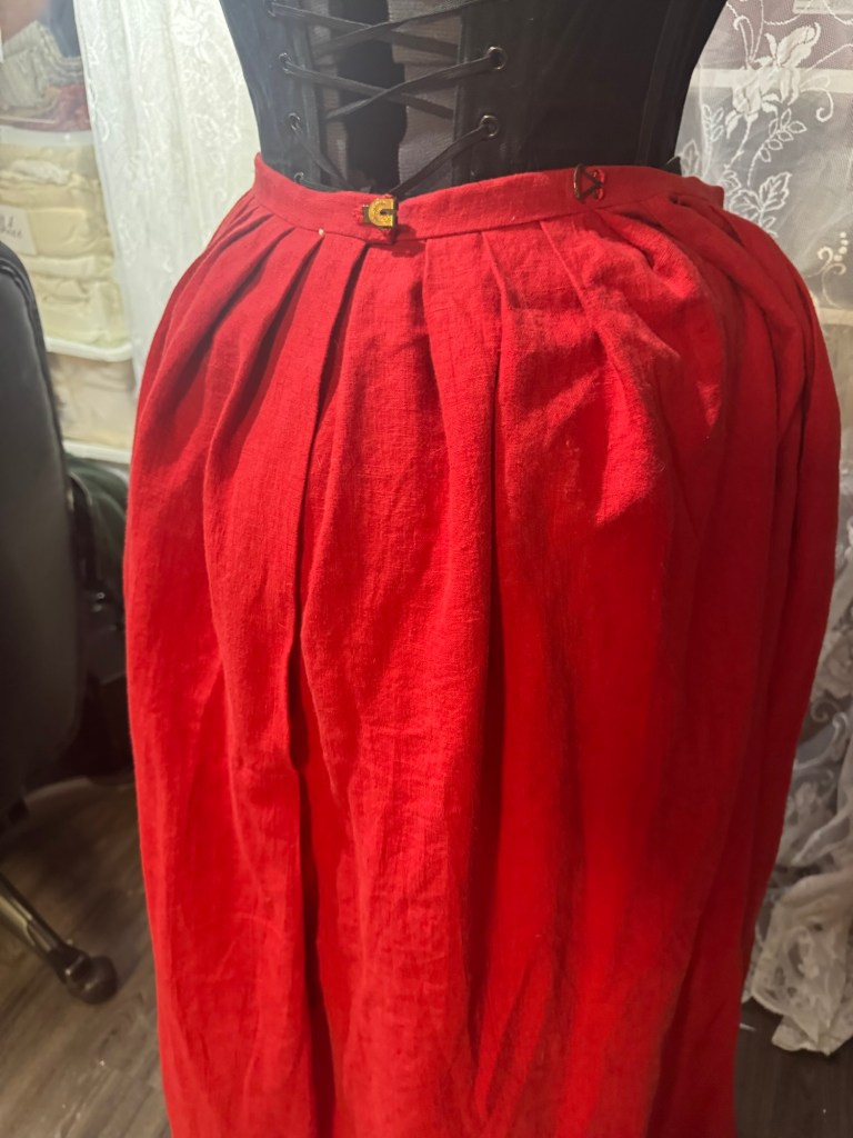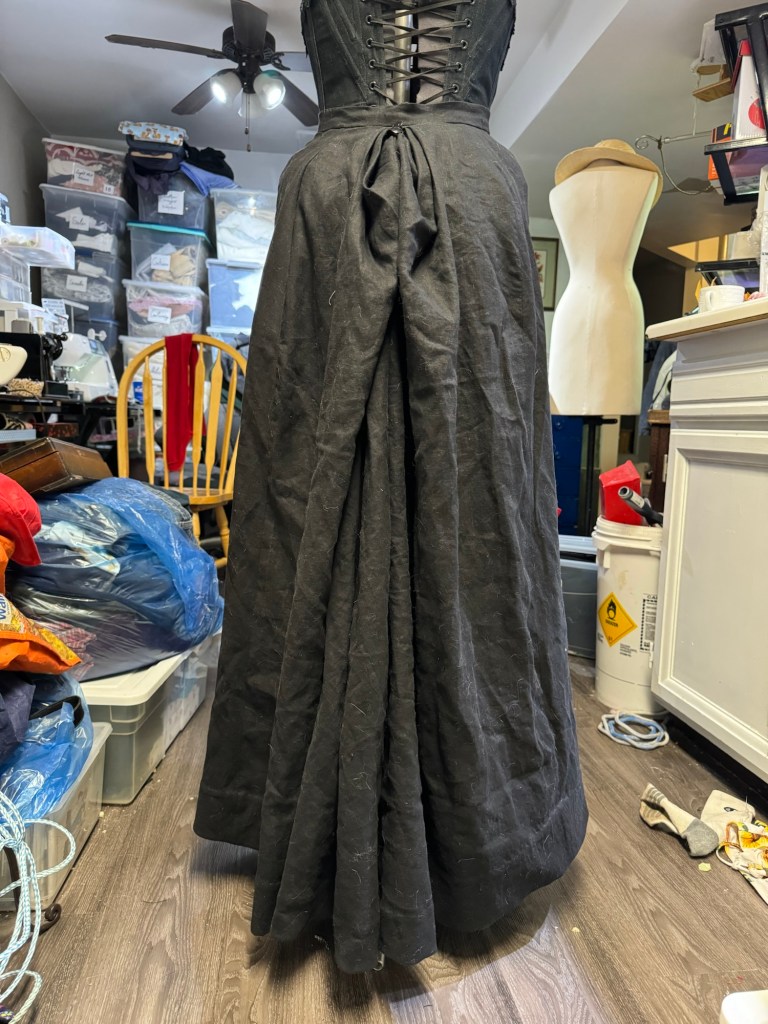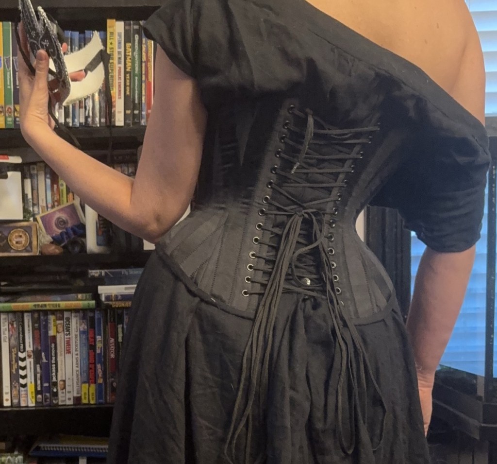 The busk is an old one salvaged from an early, non-wearable corset attempt, with a gunmetal finish, though that doesn’t really show in the pictures. I didn’t have any grommets to match so I used black ones, which I think were left over from the first time I used this busk, actually. I also used up almost all the boning tips I have in stash, so no more corsets until I can manage to order some more. Well, unless I just use plastic boning.
