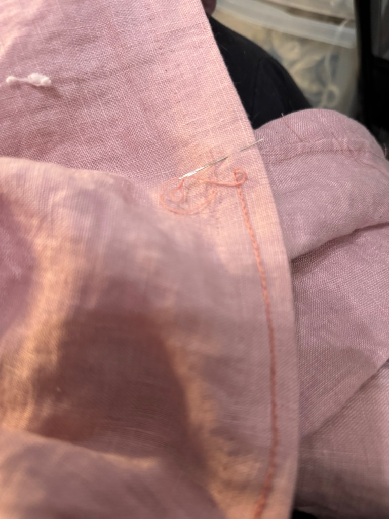 I added a waist stay, though the twill tape I used isn’t as aggressively stable as the grosgrain ribbon I prefer to use. It matched though.