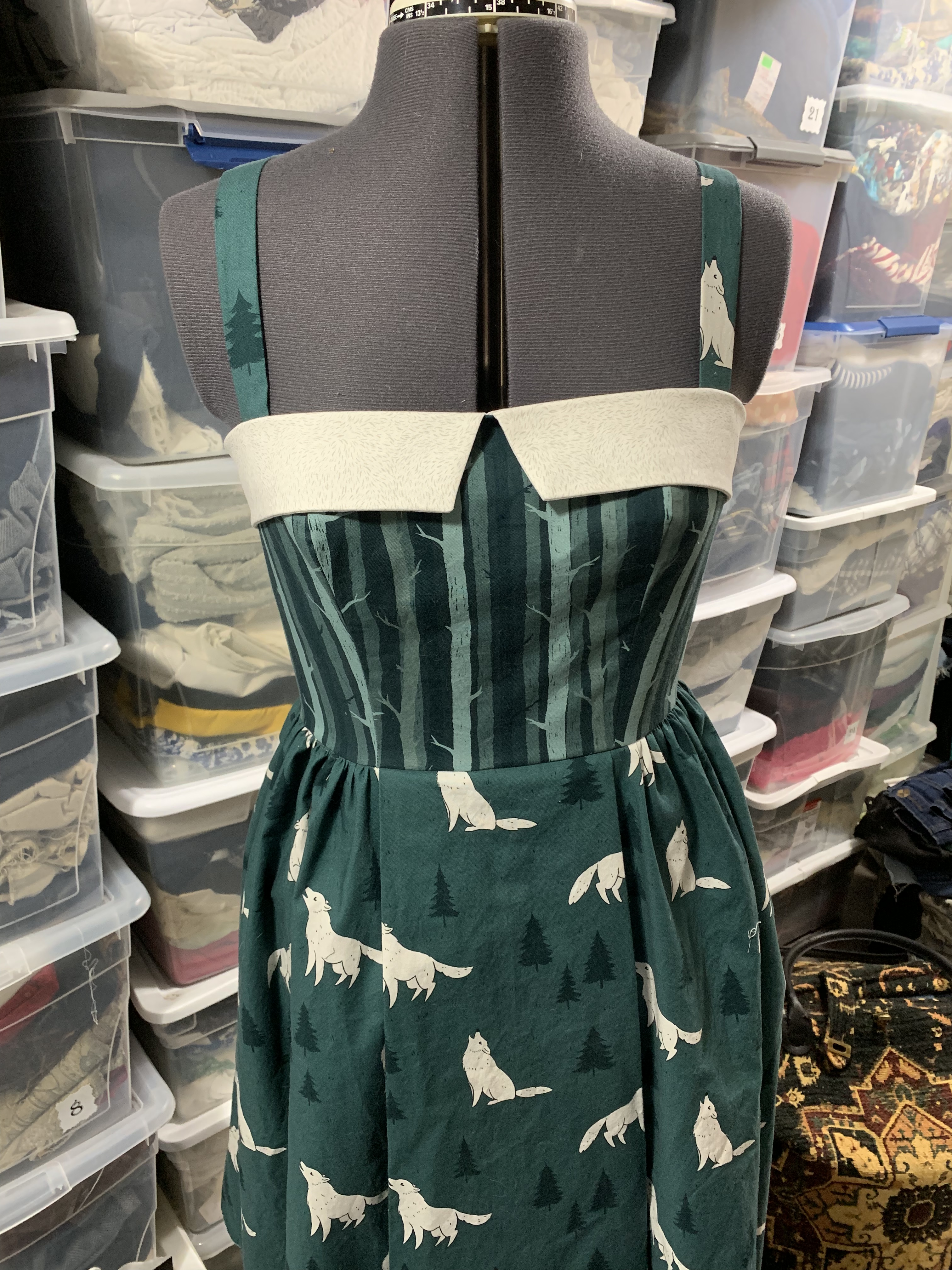 The pattern called for somewhere over 4m of fabric in the narrower width. With a bit of measuring I estimated that about three meters were needed for the skirt alone. However, it turned out the bolt of the wolves and trees print was divided right down the middle into two sections of about 2.6m each. So I took one of them home and resolved to Make It Work. I was fairly sure if I really ran short I could shorten the skirt an inch or two without causing a problem. Which in hindsight I could’ve, but I managed to squeak out all the pieces with only a little fudging, though there was no attempt to refine print placement. It is a pretty fun skirt, though, with subtle shaping and a front panel framed by pleats that’s just begging to be made in a contrast fabric.