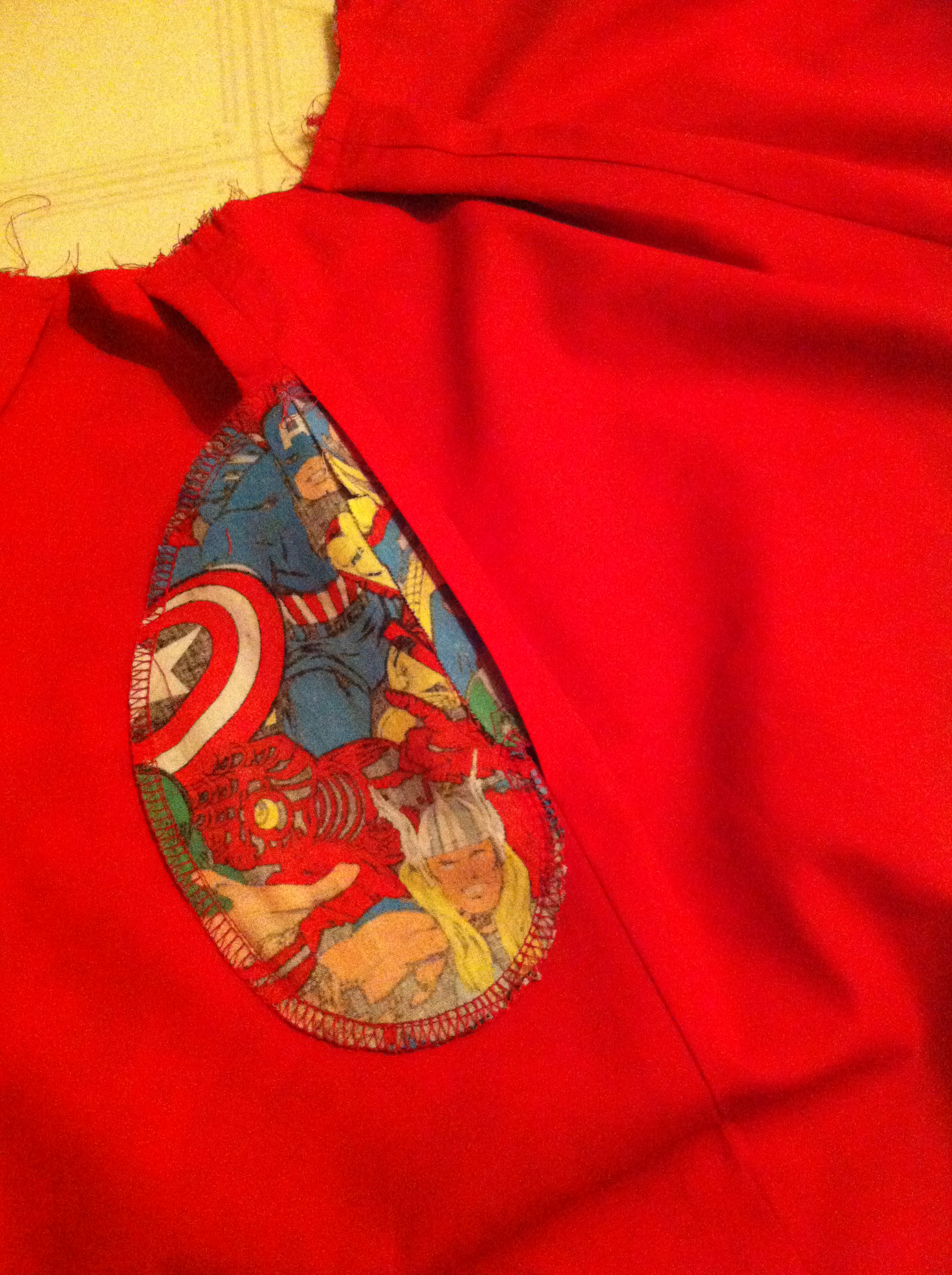 I was really at a loss about the tail—looking at a stuffie doesn’t give you much idea of size. How long should it be? How sharp and big should those zig-zags be? How far our should the brown base extend? In the end, I’m pretty happy with my first attempt, which is good, because I didn’t have enough extra fleece to do a bunch of test versions. Once we figured out where the tail should attach on her butt, (and I added some extra stitching and elastic to support the seam in that area) the next problem was the stripes. Tyo wanted the stripes to extend around onto her sides. This caused me to alter the construction order; I sewed the back pieces together and then the front pieces to each side, so I had one big onesie-piece to applique the stripes onto. There was just barely enough space to fit the two stripes between the tail and the bottom of the armscye.