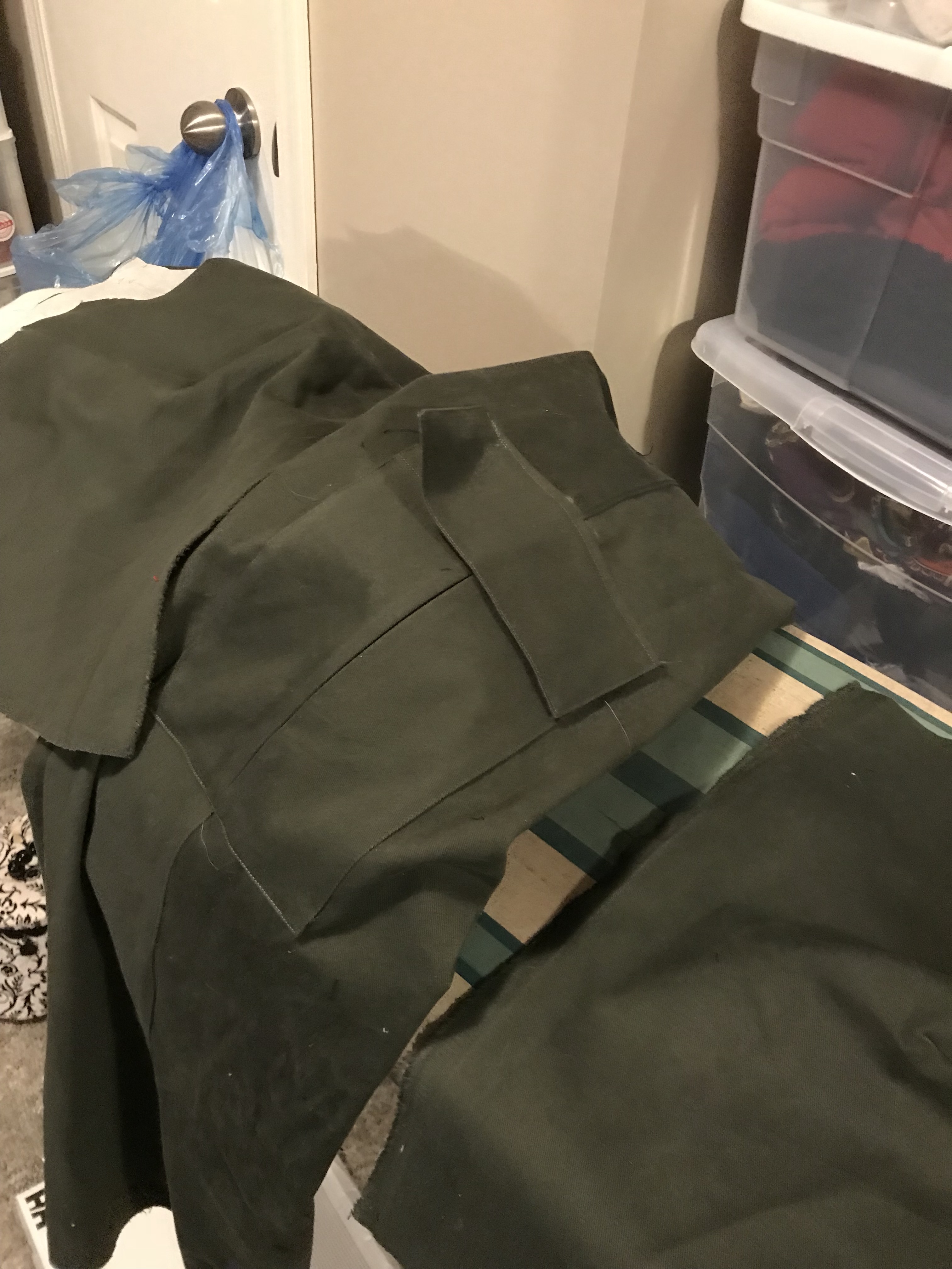 There isn’t much to say about the rest of the cloak construction—it’s a lot of long, straight seams. The shoulders are a wee bit wide but then I was cutting the XL size since it was already cut out and I always hate to lose the larger sizes but also there’s no way I was tracing out those giant pattern pieces. I figured I would narrow them if I felt it was a problem (which wouldn’t be hard) but honestly if I wasn’t looking for the problem I don’t think I would have noticed.