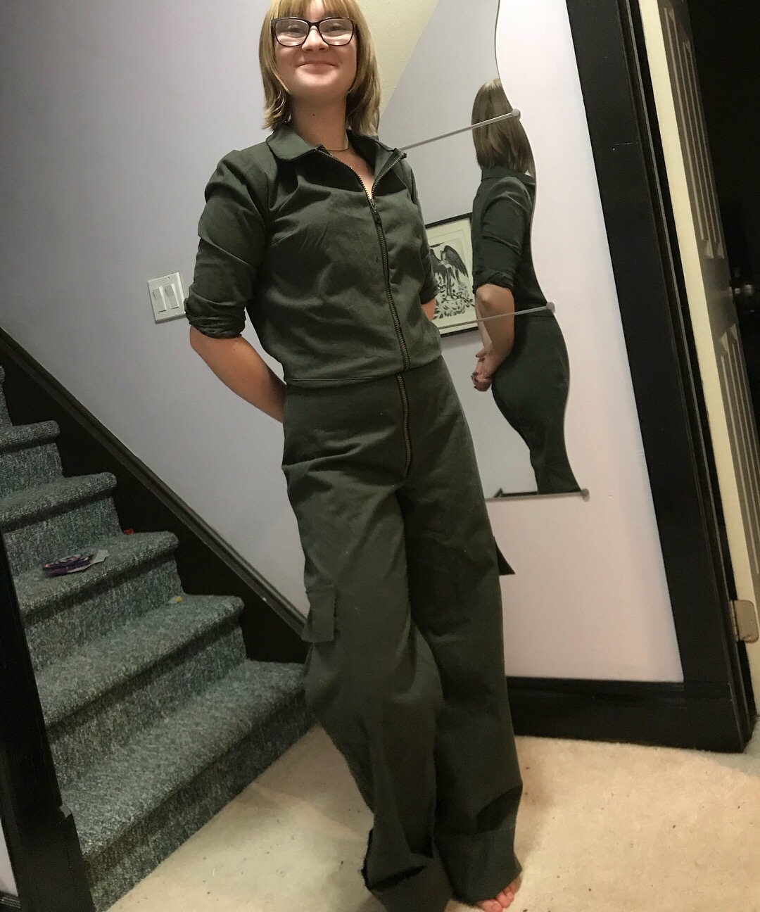 I tried to make Tyo do most of the work, but as the evening wore on and time grew short I wound up doing more of it. So she did the cutting out, and constructed the pants (including cargo pockets!) mostly on her own, but I did all the sewing for the top except the darts. Fortunately I noticed that the KS seam allowances for the jacket/top were only 1/4” BEFORE we sewed anything at 5/8”, which would’ve been both hilarious and painful. I did manage to insert the zipper inside out.