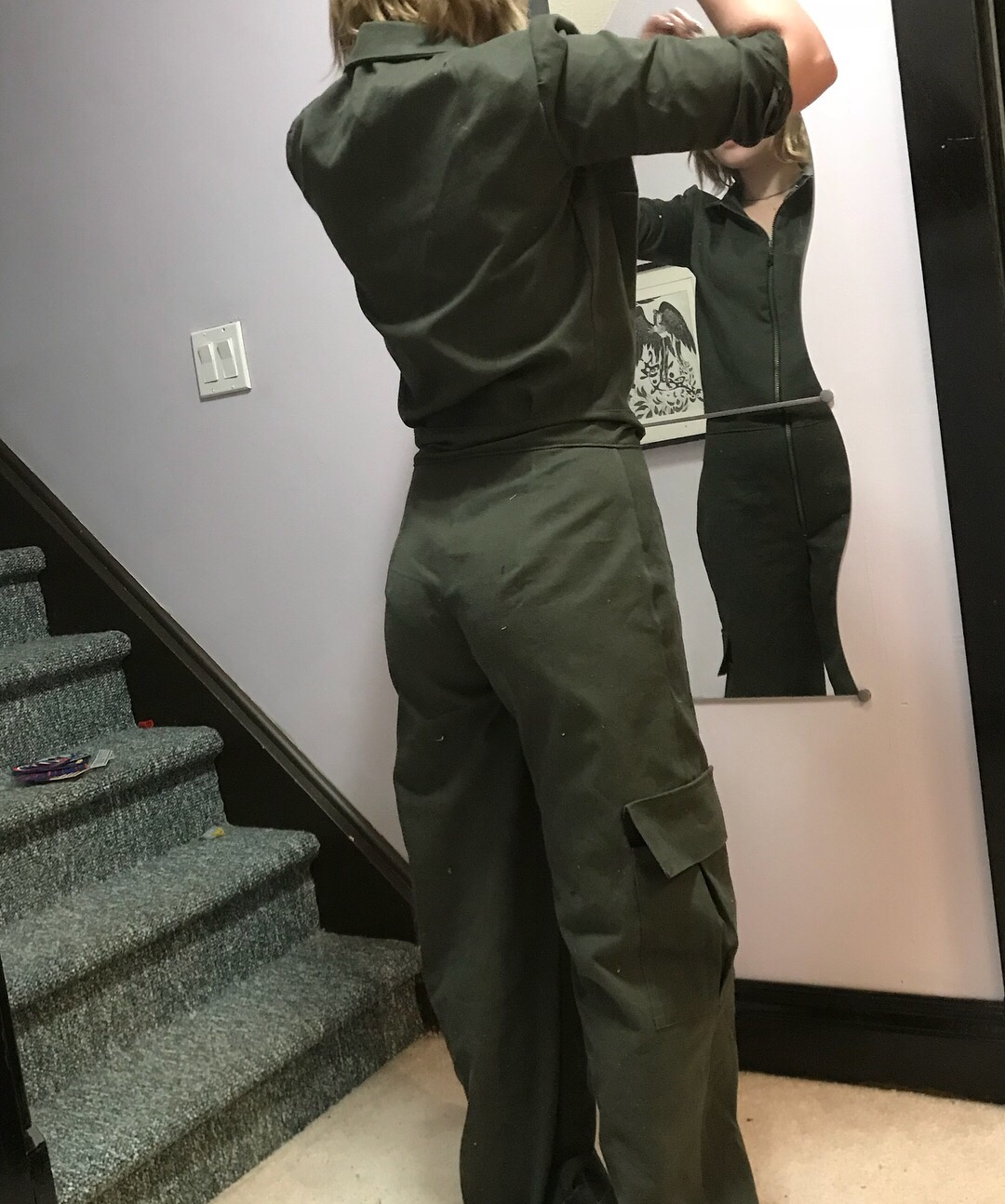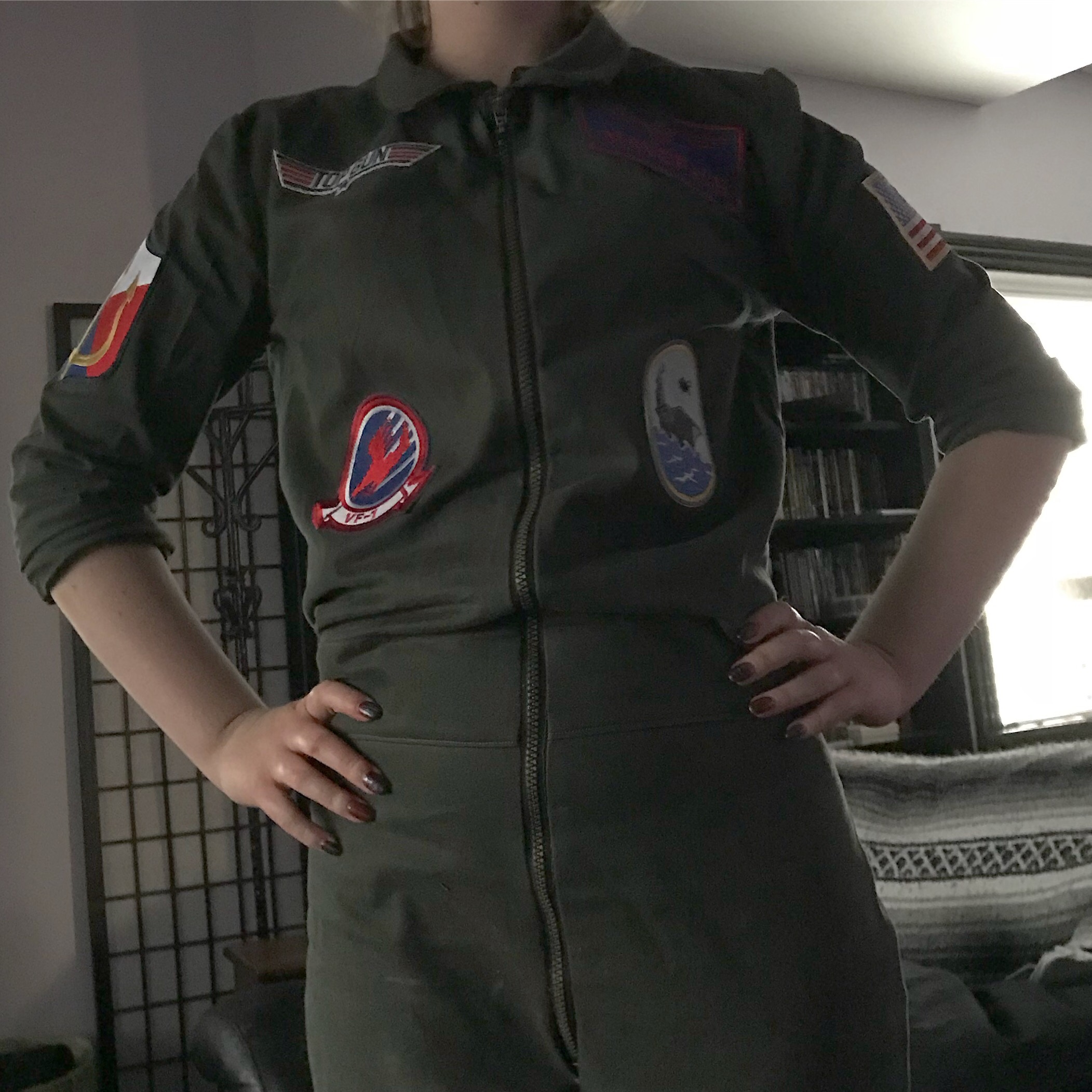 You may have noticed the cuffs at both sleeve and pants hems. This is because both are unfinished. And yet, sometimes that’s good enough. She can finish those for next year, when it gets reworked into a ghostbusters costume.