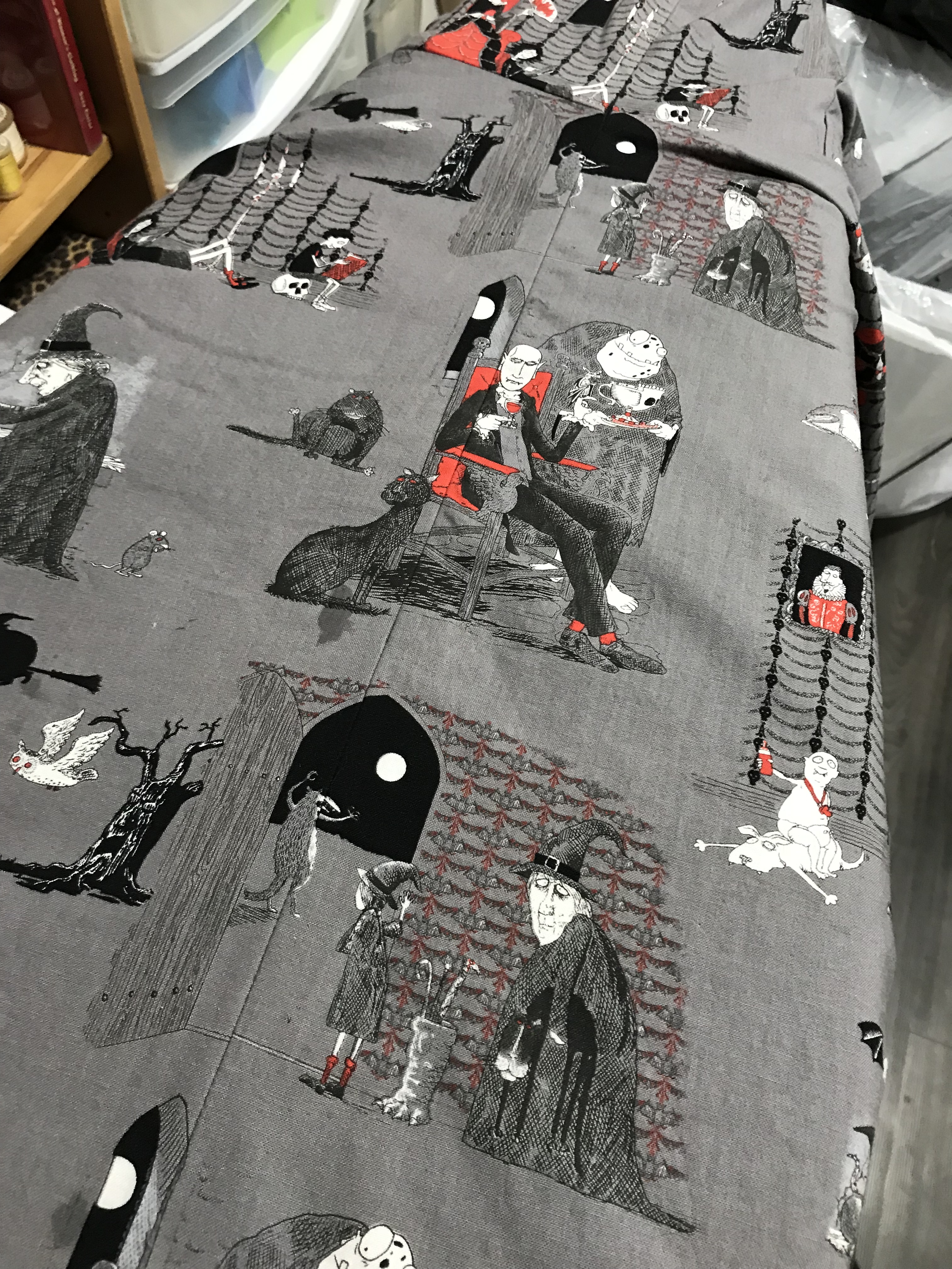 Repeat patterns help a lot for speeding up Hallowe’en sewing. For the coat, we settled on