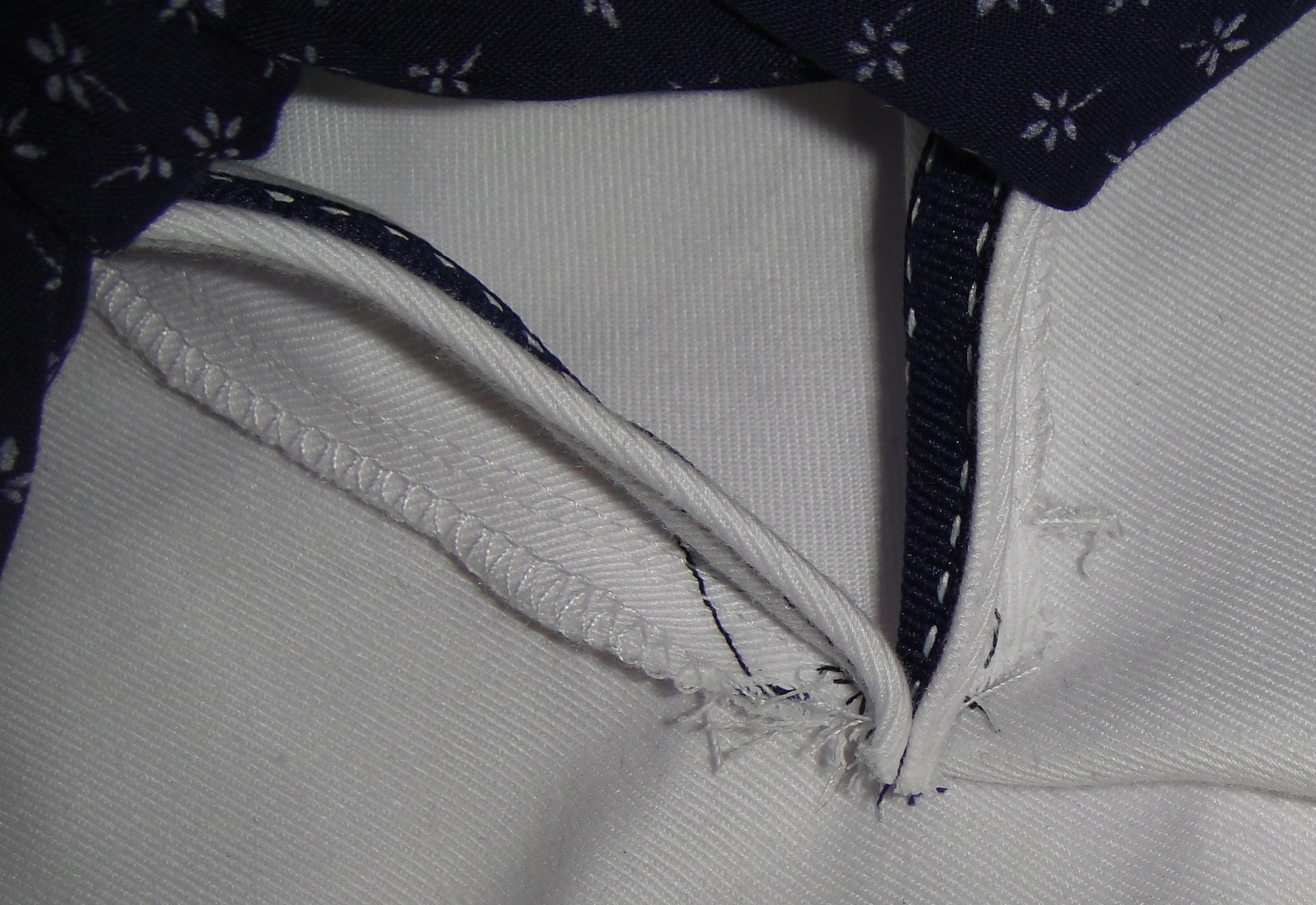I did think to use my navy trim to cover the hems for the sleeves—nice, clean finish. This mock-grosgrain ribbon doesn’t go around curves as nicely as real grosgrain, but with the running stitch decoration you can tighten up the inner side and make it curve fairly nicely, which I do like.