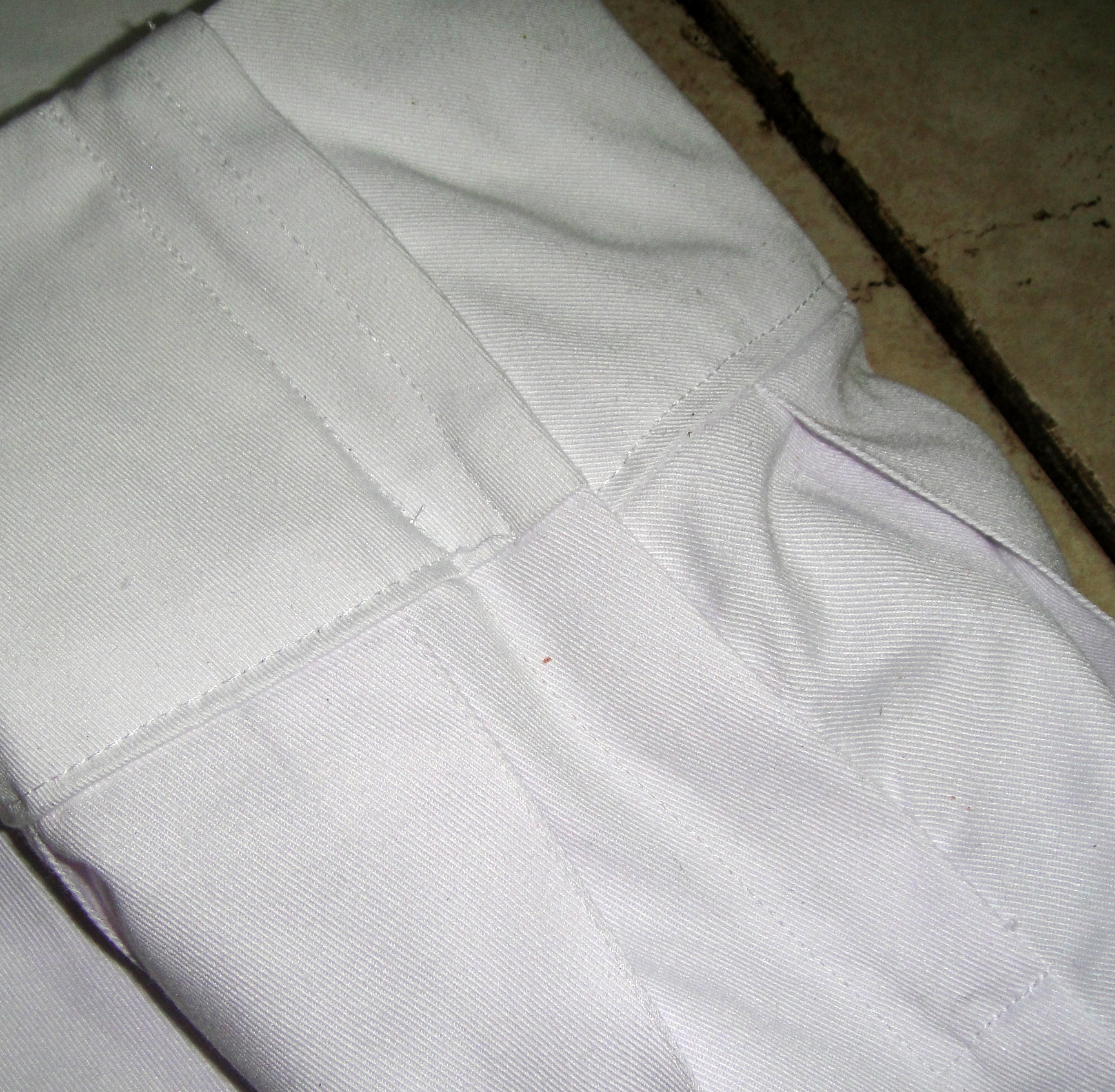 same idea as a jeans fly, except on a much narrower scale. I think it was the narrowness that befuddled me—anyway, results were not so good. Laughable, really. Although it works fine, it just isn’t pretty or well-finished. And then I couldn’t quite wrap my head around putting in the lining for the yoke, and managed to create some weird things like a part that folds over the top of the zipper. Ah, well. Costume-grade, sigh. I should’ve just put the lining in first. I should’ve done a lot of things differently, really. Live and learn, etc. The pleats didn’t come out even, either, even though I marked them off the pattern with remarkable (for me) precision.