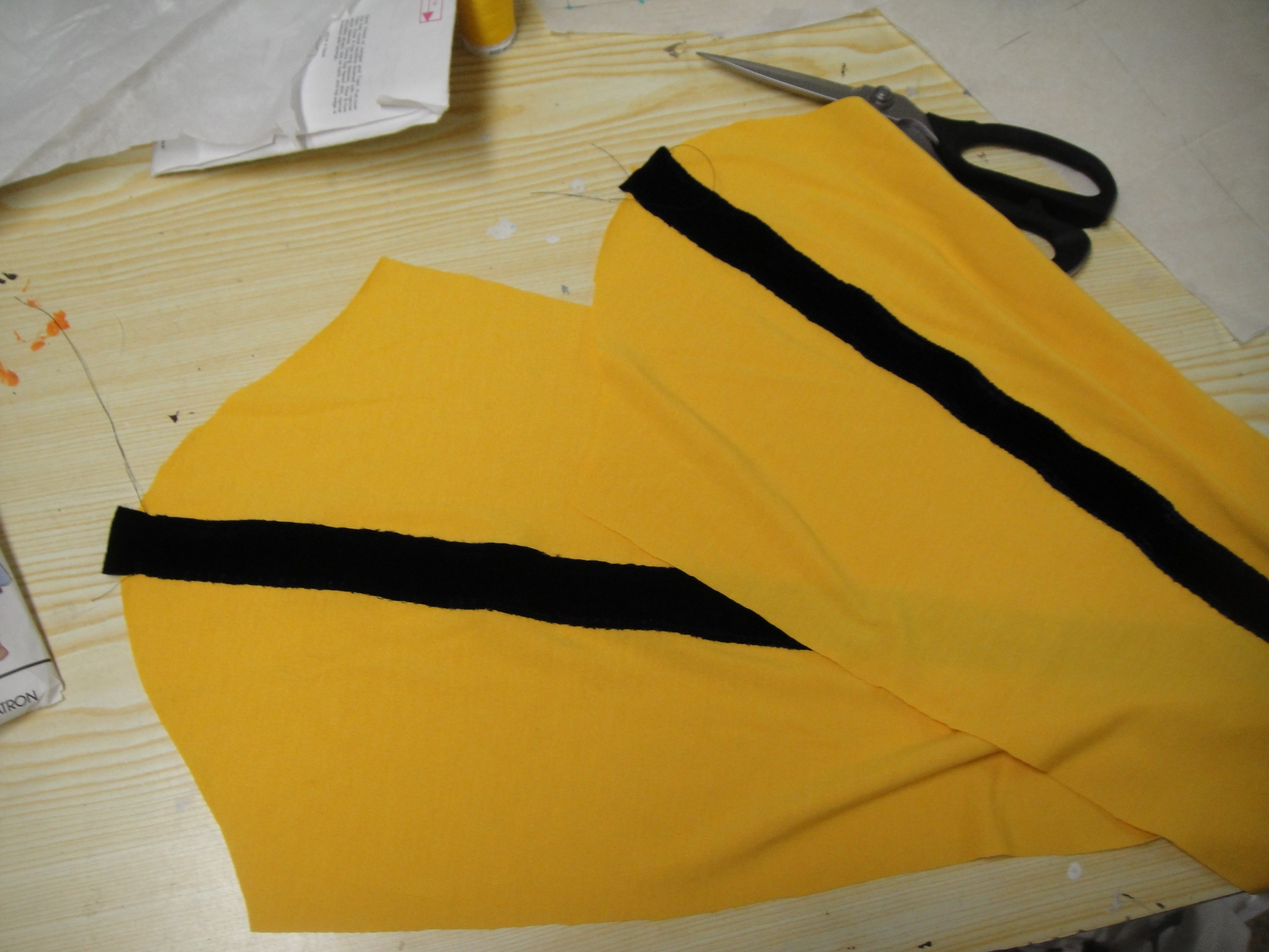 Next up: Syo’s costume. Buffy the Vampire Slayer, as cheerleader. So far, I have the sleeves! (The “black” stripe is actually blue stretch velvet I have lying around. If I get crazy ambitious, she may even get a leotard out of it.)