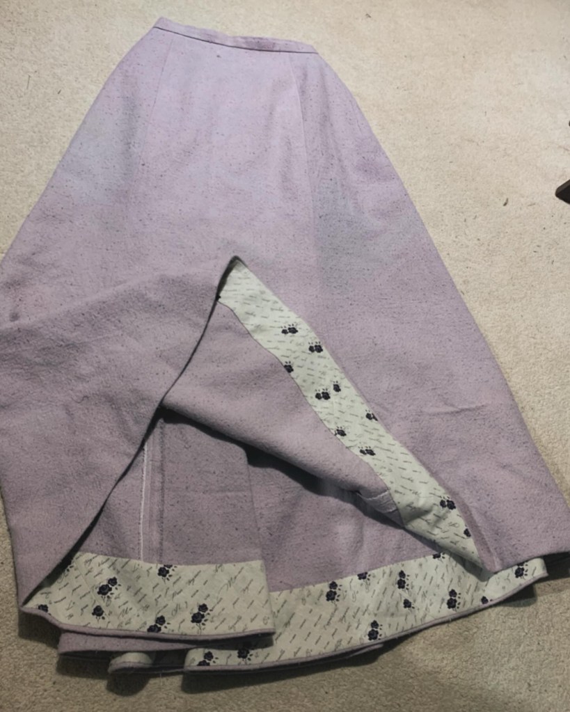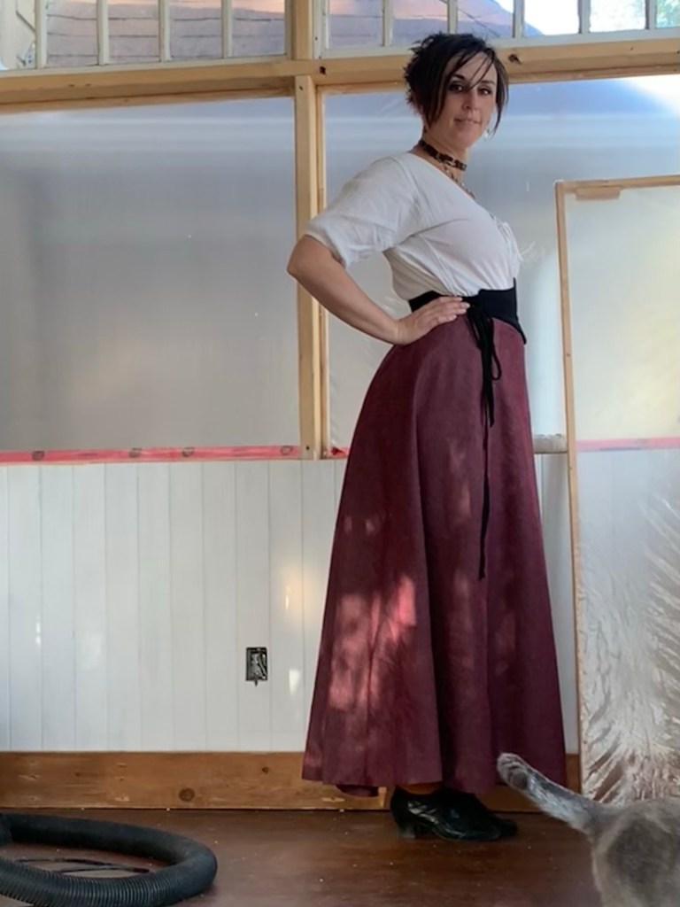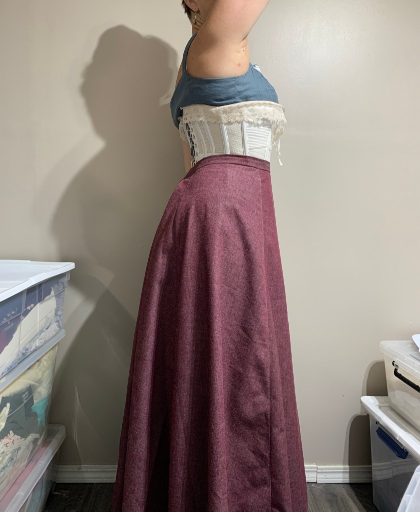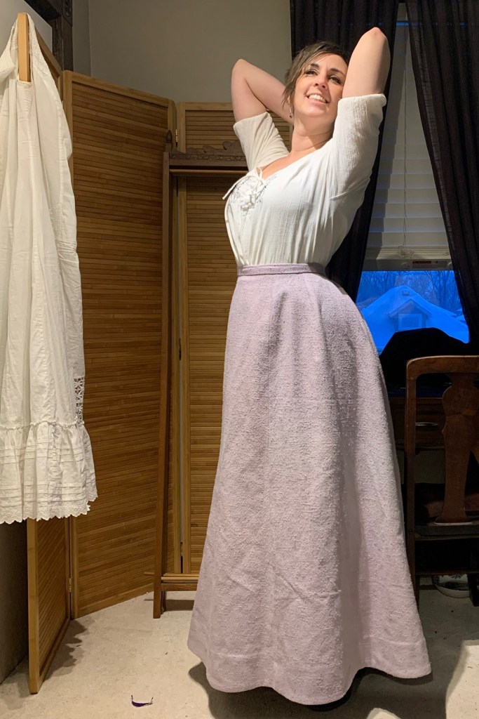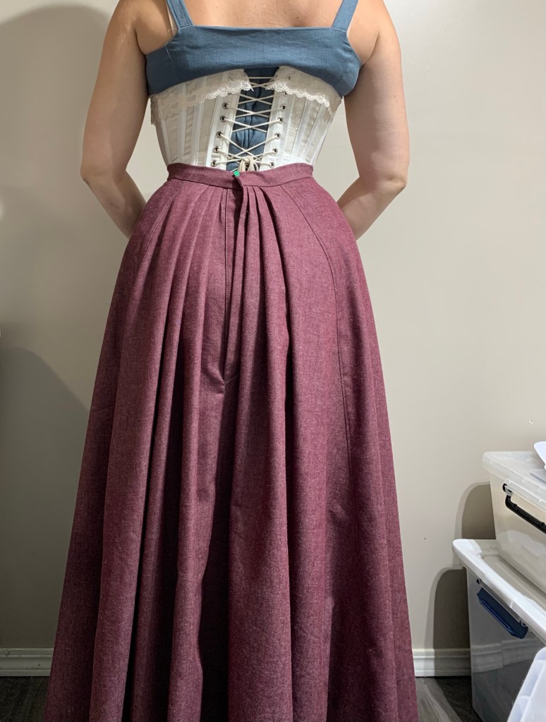 I serged off about 1/4” in length and then did a 2” hem, and I’d say the length is an excellent walking length for me, though I perhaps wouldn’t mind an extra inch if I were going for a more formal historical look.