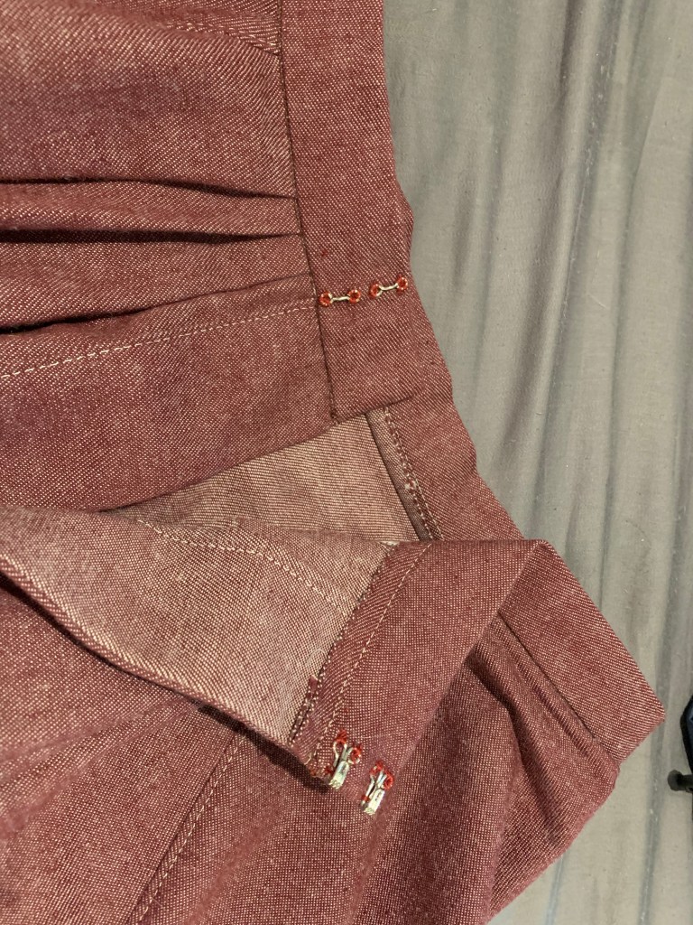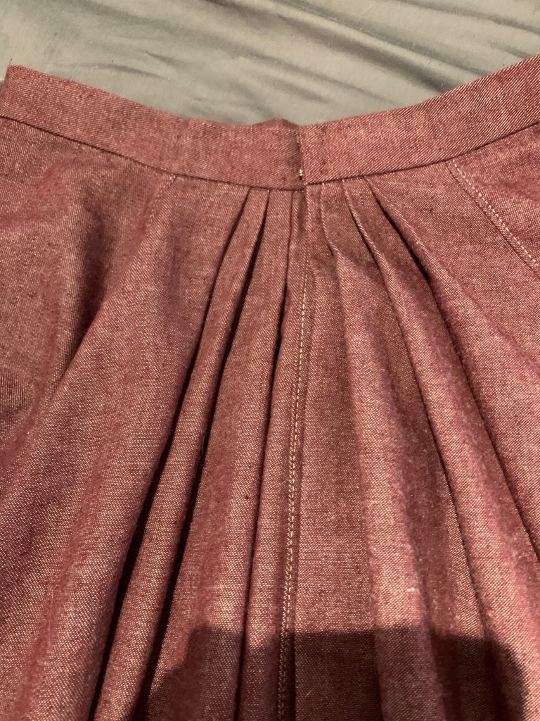 I tweaked the darts quite a bit to get a hip shape I liked, making them longer and a more sinuous shape. I also wound up making them deeper, at least partly because the waist was stretching out in my thick but weirdly soft fabric; I overshot a bit and currently it’s really too small so the back pleats aren’t lining up quite right. If I redo it, I might sub in a different fabric, like a thin cotton, for the waistband. This upholstery fabric is beefy and where all the pleats stack at the centre back my machine completely balked, although not before I had broken three or four needles trying.