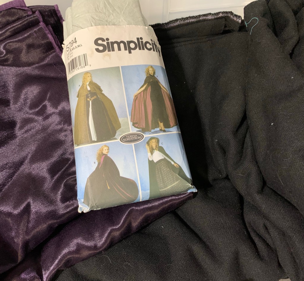 The first glitch came with the cutting layout, where the pattern instructions show it being cut out on the lengthwise fold. These gigantic pattern pieces are not being cut on the fold for any normal-width (by which I mean 60”) fabric. Incidentally, the best idea wound up being to fold my (non-directional, thankfully) fabric in half crosswise, and arrange the two main cloak pieces going in opposite directions, then cut the hood from the remnants. I wound up with around a metre extra for the outer fabric, and the merest scraps of my purple lining.