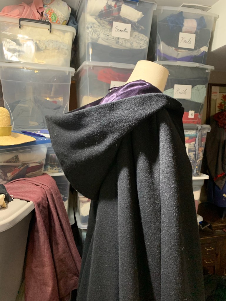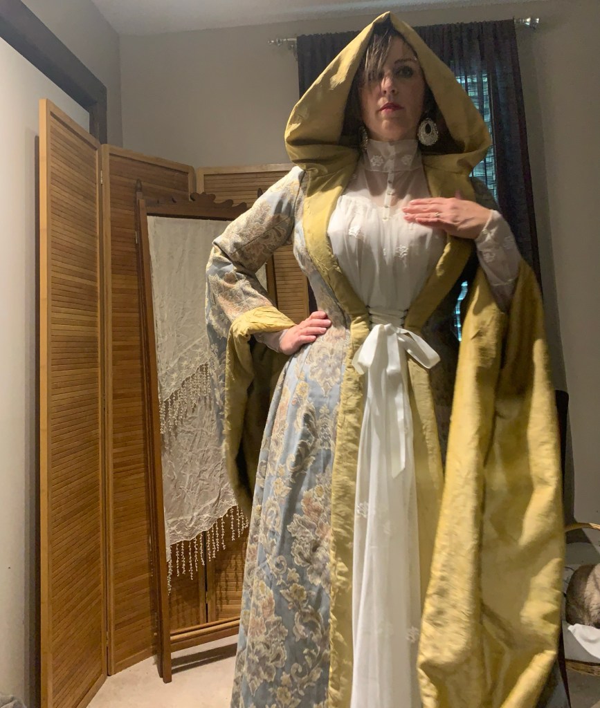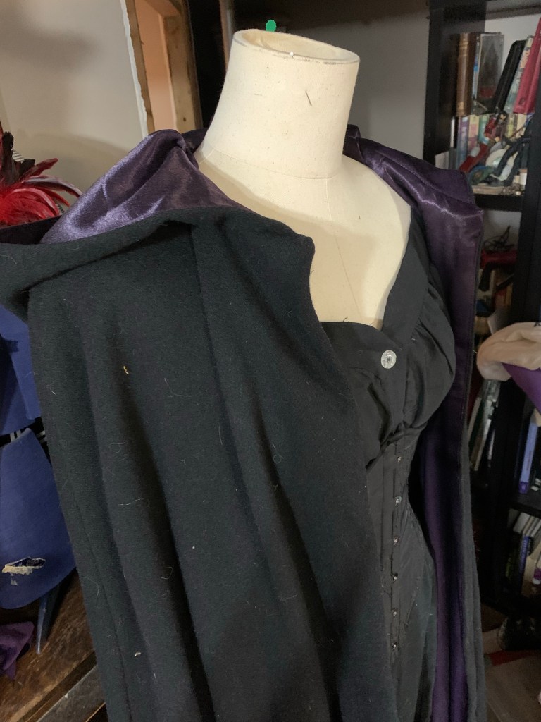 I ripped out the back seam, cut the excess fabric in half, and added an underlining of some kind of cotton sheeting to it to give it a heft a bit closer to other exterior fabric. At the moment I have the pleats hand-tacked down to keep them well-behaved (which seems typical of a lot of the originals I’ve looked at, or maybe it’s just how they’re arranged on the mannequins) but I might let that out at some point just to see. The only problem is the opulent hood covers a good chunk of it when it’s down.