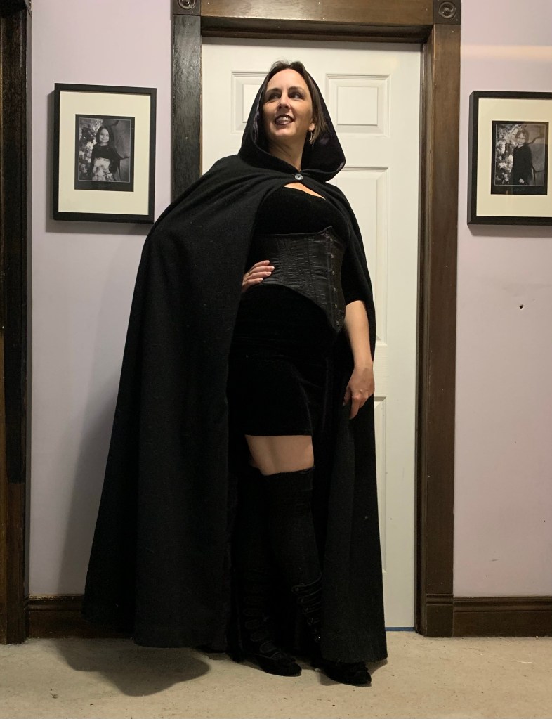 It’s not a very full cloak, actually, despite being a massive fabric hog It’s a half-circle, actually. I don’t even want to think about how much fabric a full circle this size would take). You can’t put your hands on your hips without it gaping open. However, it does hang nicely closed with arms at sides. And looks best thrown back over the shoulders anyway, I discovered.